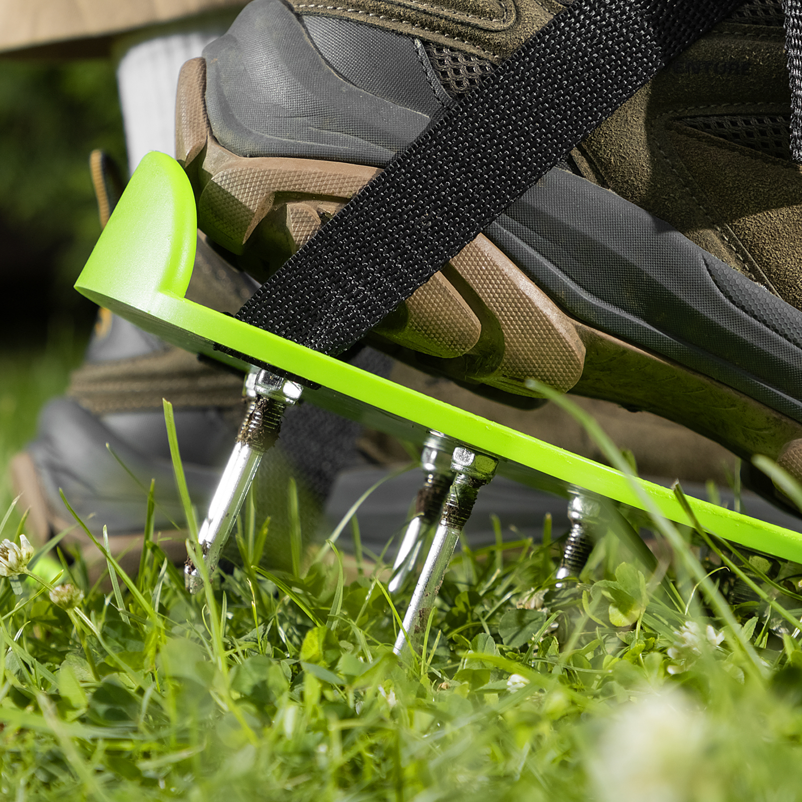 - Удобное использование — аэратор выполнен в форме платформ для ног с длинными стержнями, достаточно надеть их и походить по участку.