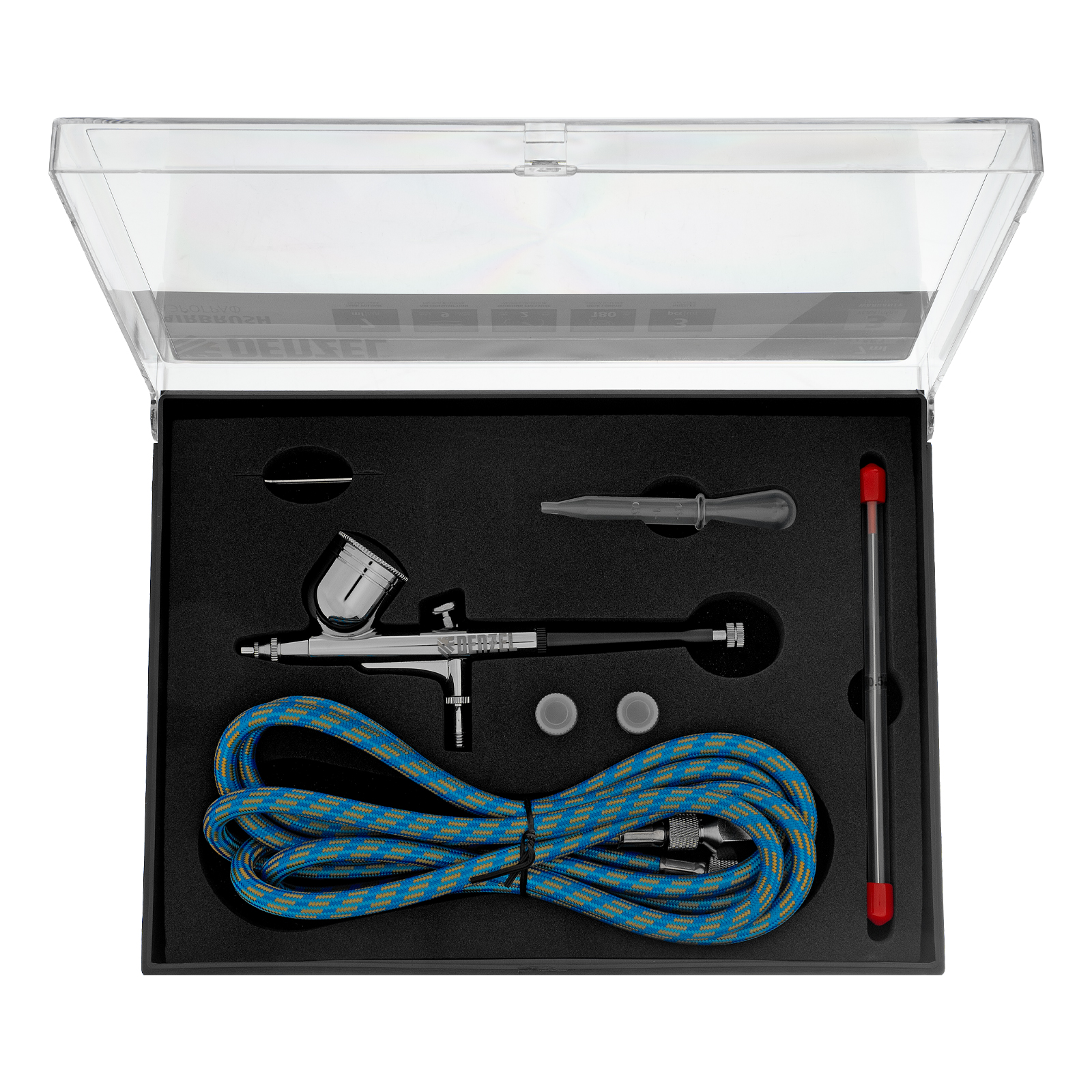 - Надежная упаковка — аэрограф поставляется в прочном кейсе с ложементом.
