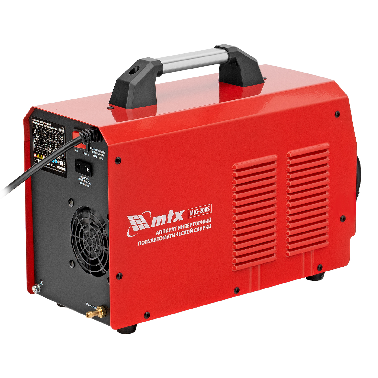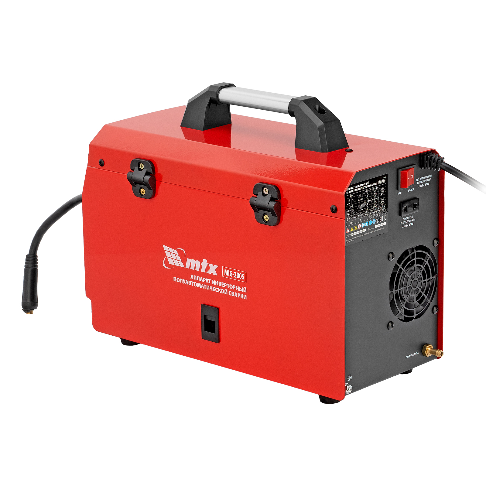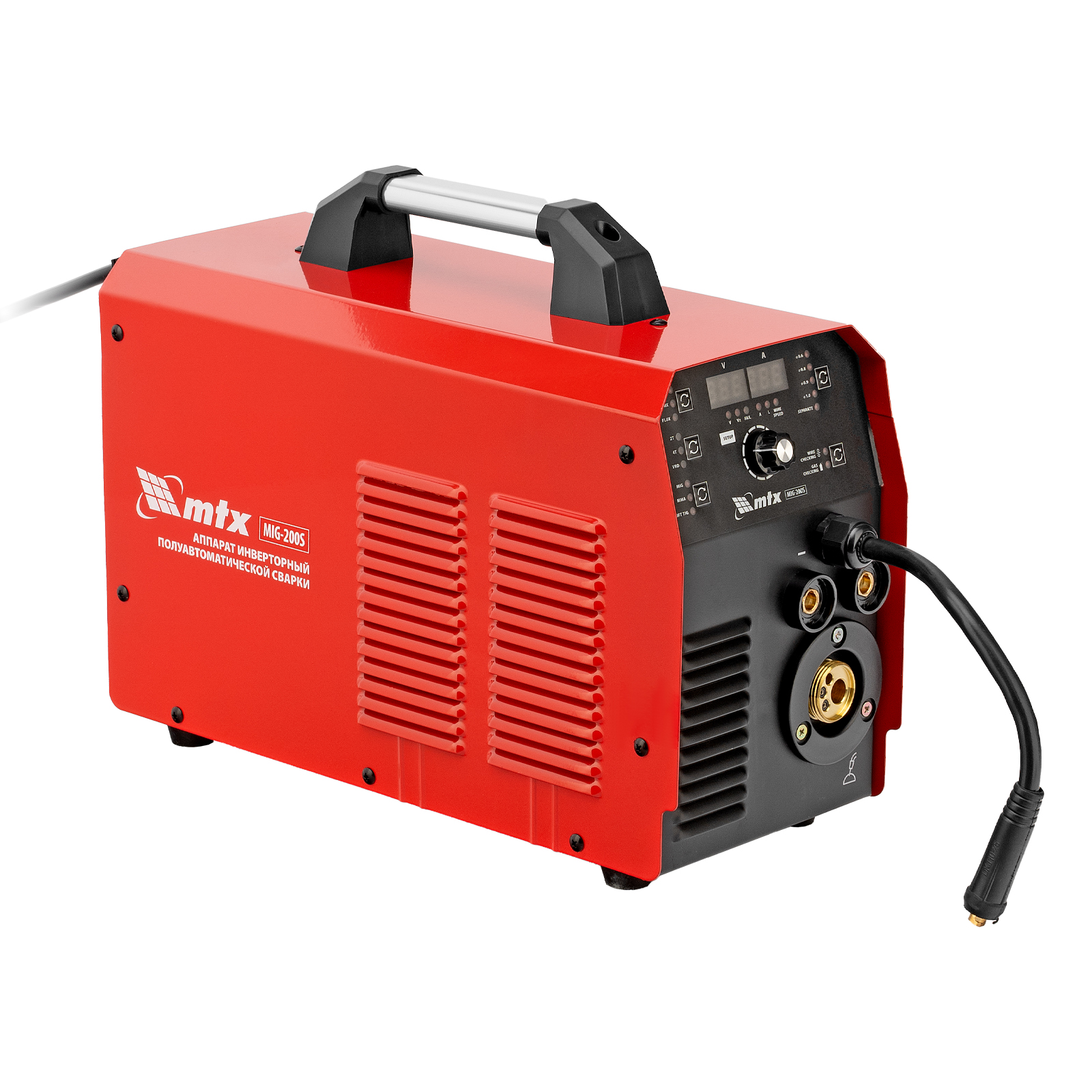 Инверторный аппарат полуавтоматической сварки MTX MIG-200S 94303, предназначенный для сварки на максимальном токе до 200 А, имеет продолжительность включения 60% и совместим с катушками весом до 5 кг. Используется для работы со сталями, черными и цветными металлами. Сварочный аппарат изготовлен с использованием передовой технологии IGBT, позволяющей получать стабильный сварочный ток на выходе. Аппарат имеет высокий КПД при низком энергопотреблении, способен работать при пониженном до 180 В напряжении.