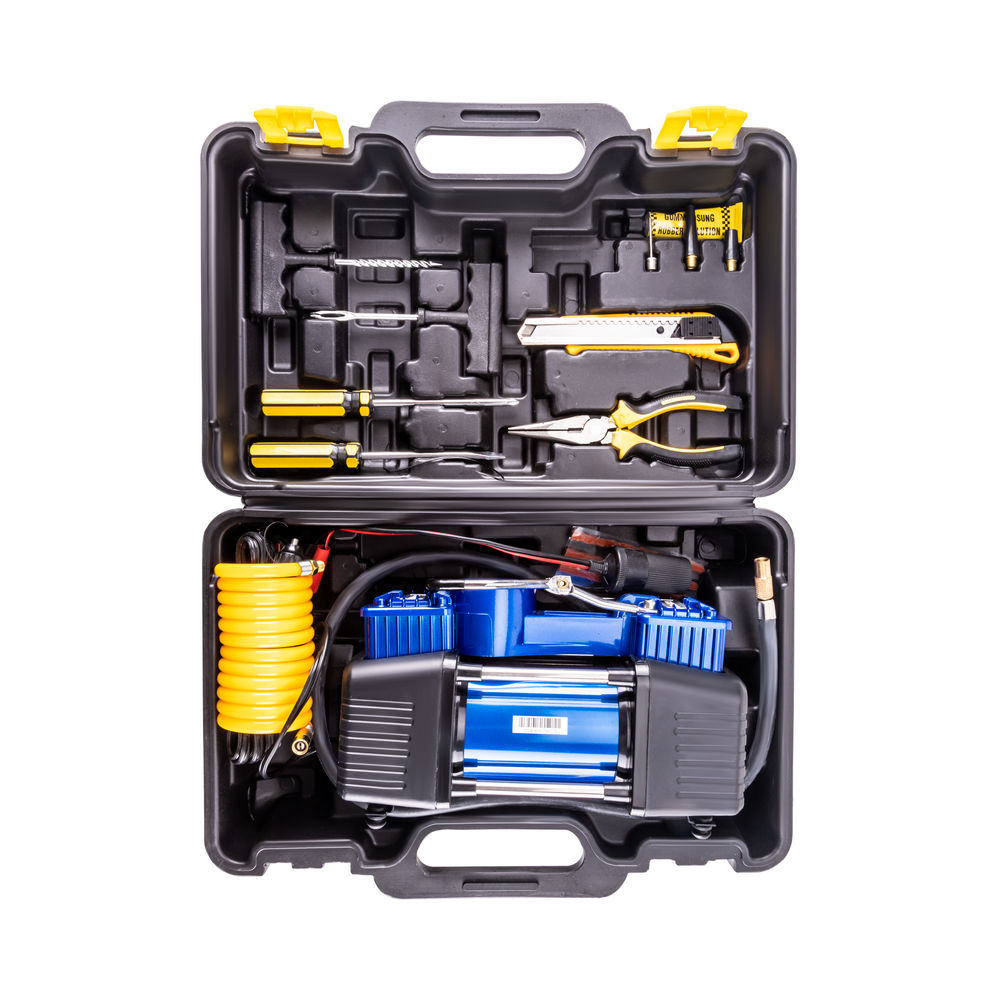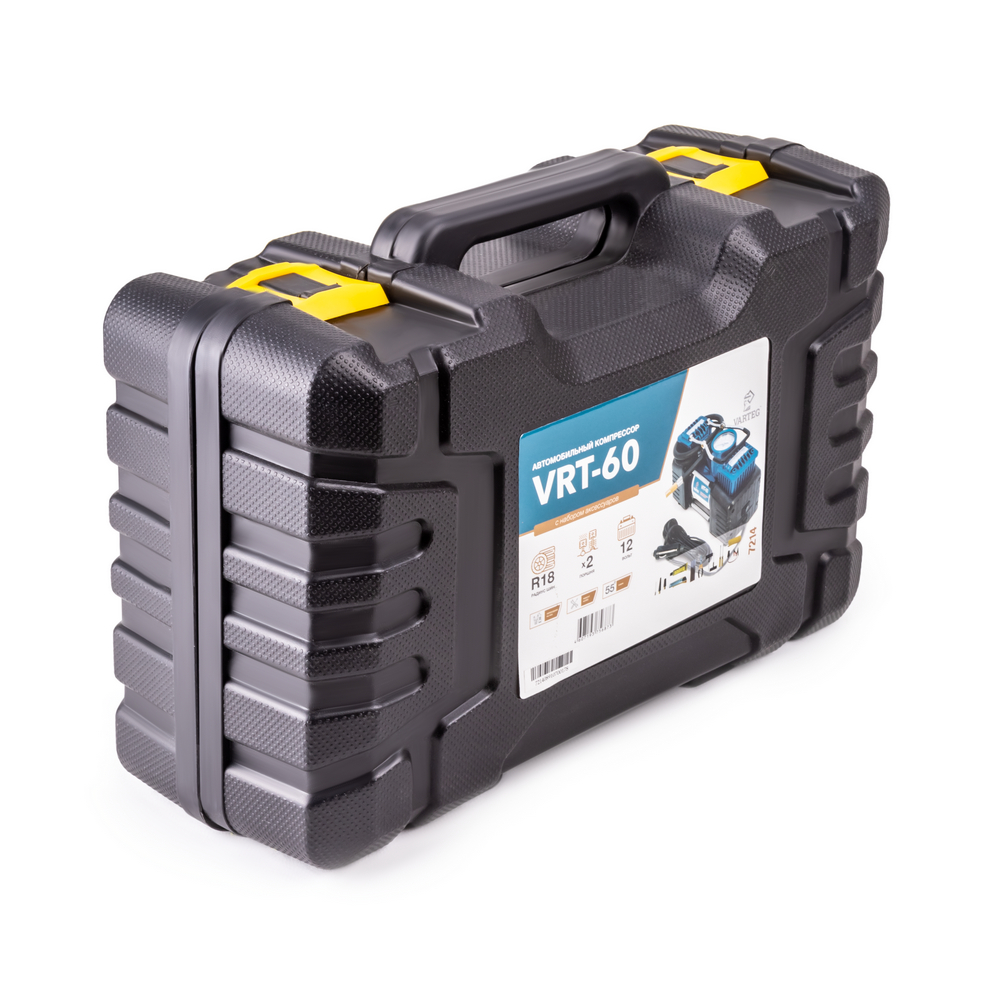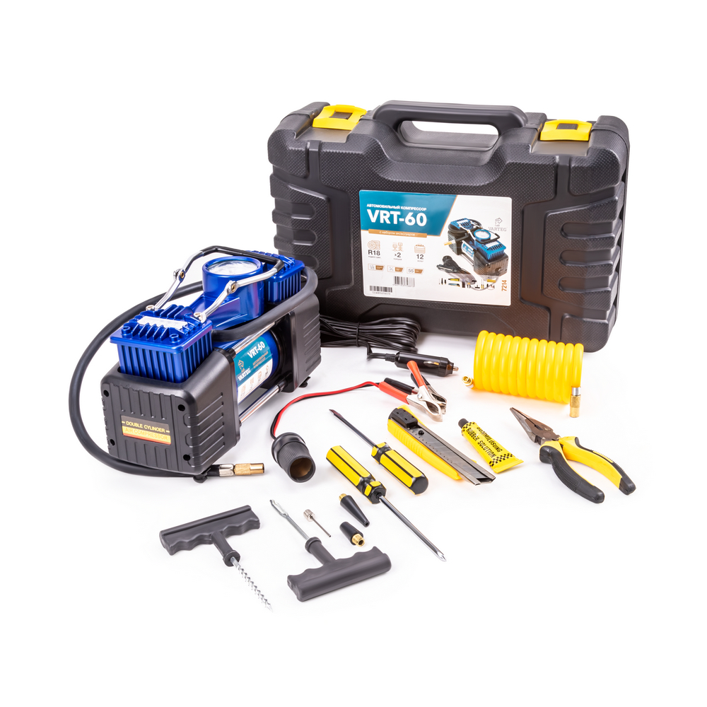 Автомобильный компрессор VARTEG VRT-60 с набором аксессуаров предназначен для накачивания автомобильных, мотоциклетных и велосипедных шин, надувного спортинвентаря. Современный, удобный и простой в применении компрессор с расширенной комплектацией игл-переходников - незаменимый помощник не только для автомобилистов, но и для любителей активного отдыха на природе и занятий спортом. Прекрасно подходит для накачки велосипедных шин, мячей, надувных лодок, матрасов. Поставляется в практичном пластиковом кейсе, который, помимо прочего, включает в себя набор ручного инструмента для мелкого ремонта. Компрессор оснащен удобной транспортировочной рукояткой. Металлические части основных деталей и подшипники обеспечивают надежность и высокий ресурс работы. Рабочее напряжение составляет 12 Вольт. Длина кабеля питания 3 м.КОМПАКТНЫЙ: Компактный и эргономичный корпус в пластиковом кейсе, небольшой вес – это одно из самых удобных решений для рыбалки, туризма и прочих выездных мероприятий.РАСШИРЕННАЯ КОМПЛЕКТАЦИЯ: Плоскогубцы, 2 шила, клей, набор ремонтных жгутов, универсальные насадки, 2 отвертки – в комплекте есть всё необходимое для мелкого ремонта и ремонта колёс в дорожных условиях.ПРЕИМУЩЕСТВА:Поставляется в практичном и крепком пластиковом кейсеРасширенная комплектация игл-переходниковПодключение к автомобильному прикуривателю 12 ВДополнительный набор ручного инструментаПодходит для колес радиусом до R18Оснащен удобной ручкой для переноскиНаличие манометра для контроля уровня давленияМеталлические части основных деталей и подшипникиНадежность и высокий ресурс работыПростота и комфортКОМПЛЕКТАЦИЯ:Автомобильный компрессор VRT-60 – 1 шт.;Адаптер для подключения к АКБ – 1 шт.;Спиральный воздушный шланг – 1 шт.;Плоскогубцы – 1 шт.;Шило – 1 шт.;Клей – 1 шт.;Штопор (для клея) – 1 шт.;Жгуты ремонтные – 3 шт.;Универсальные насадки – 3 шт.;Отвёртка «-» – 1 шт.;Отвёртка «+» – 1 шт.;Инструкция по эксплуатации + Гарантийный талон – 1 компл.*Производитель оставляет за собой право менять комплектацию оборудования.