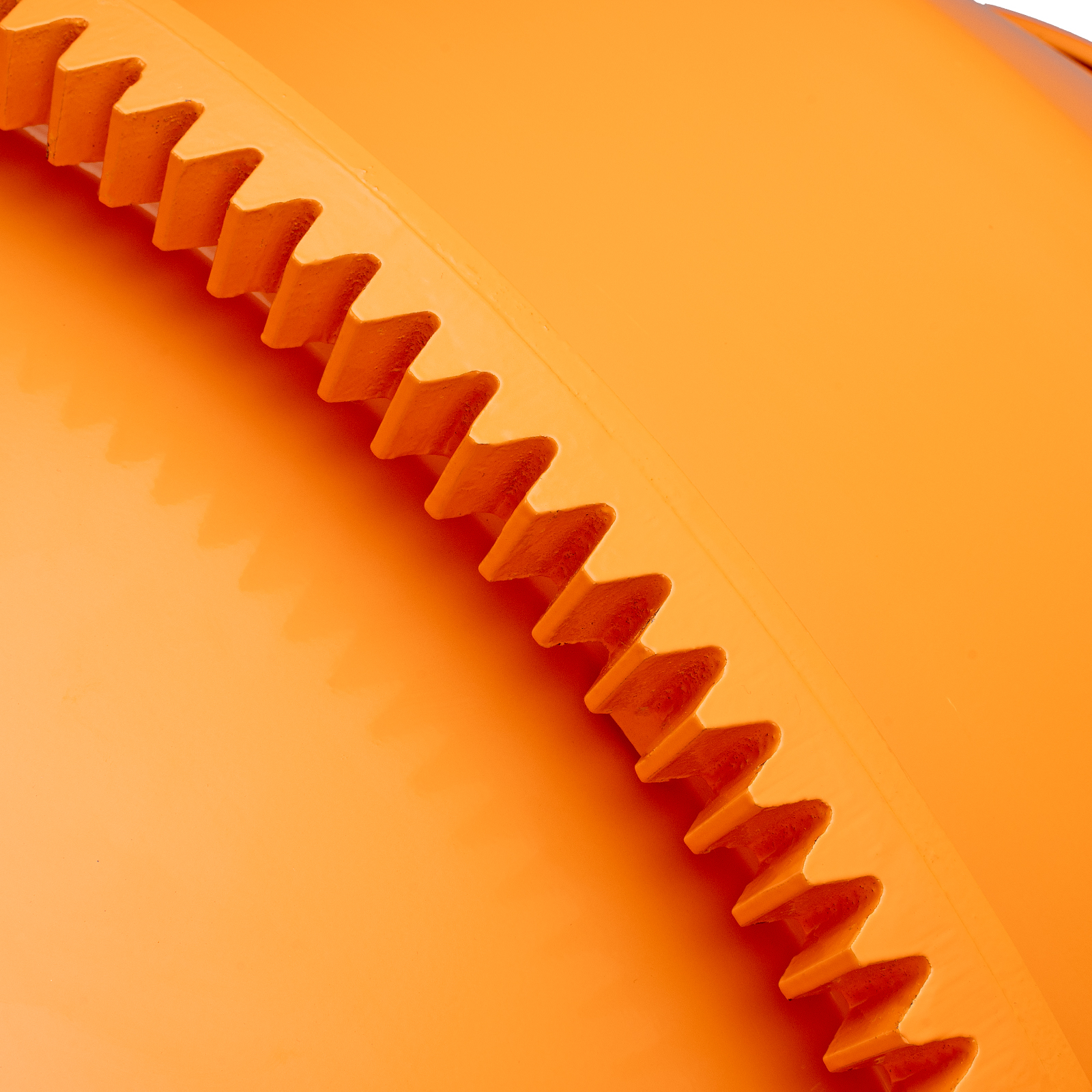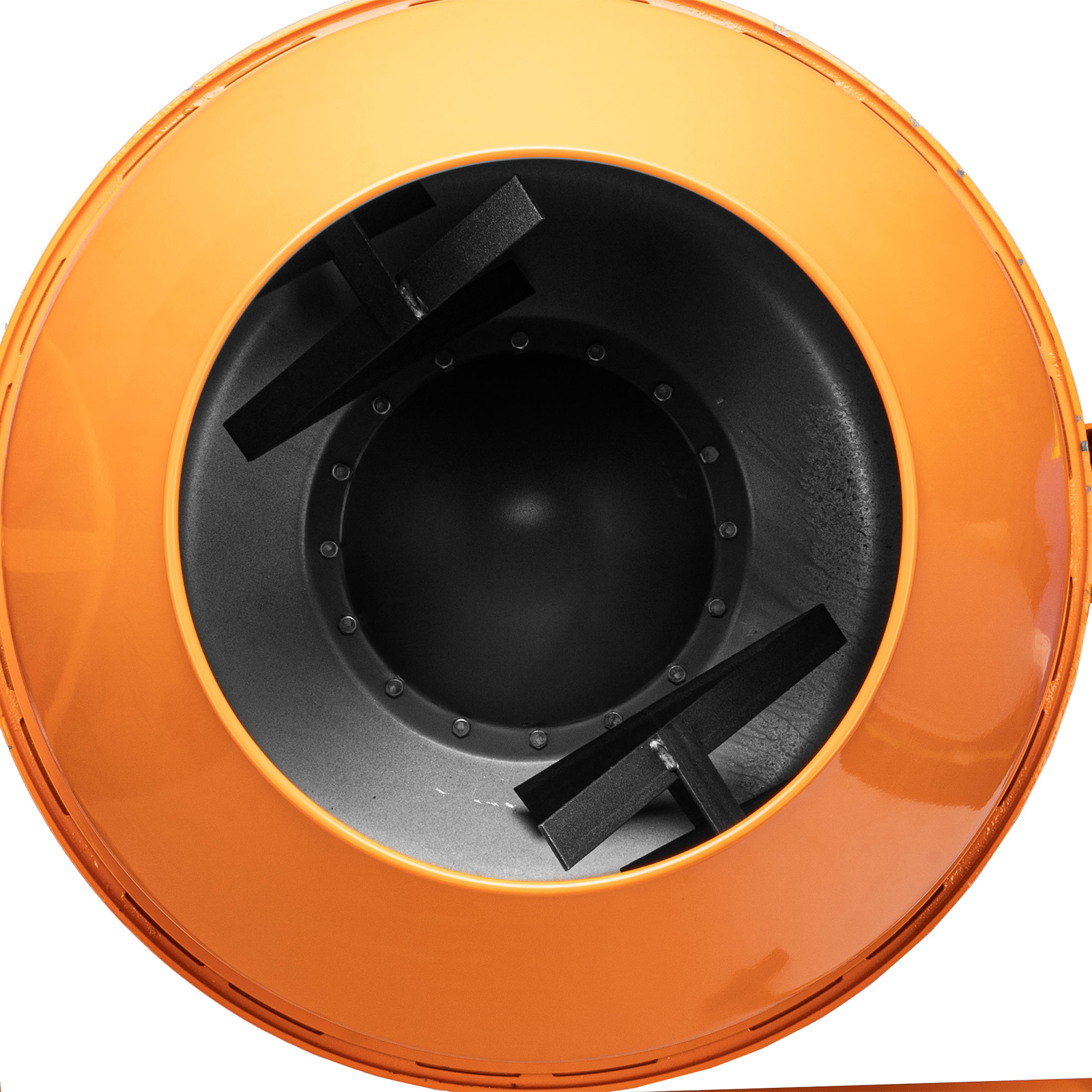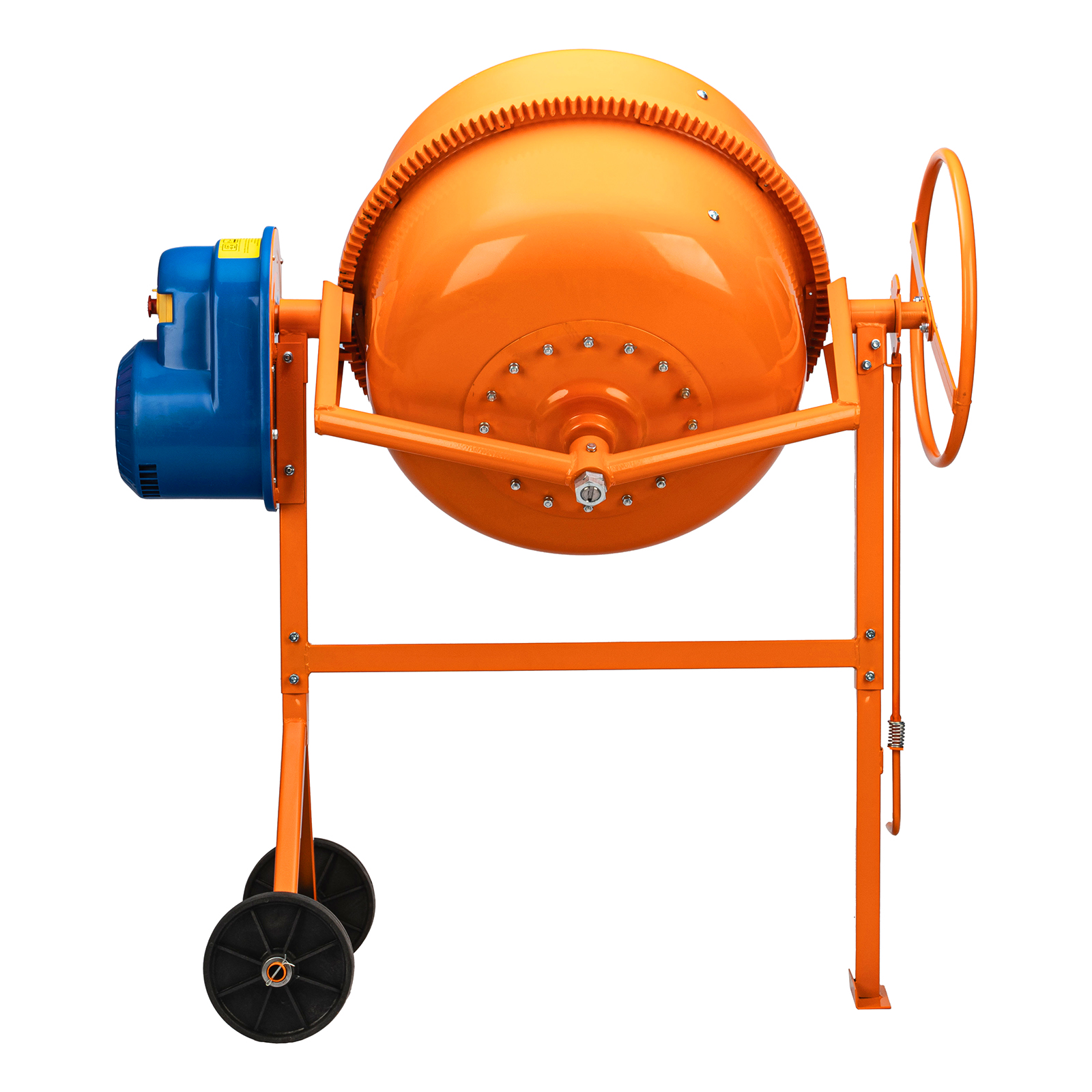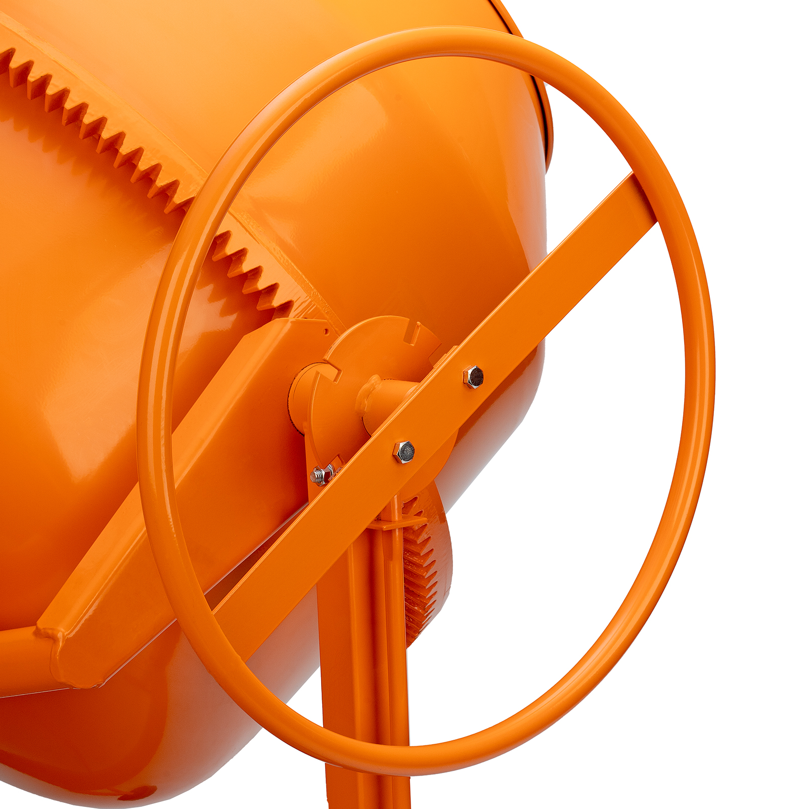 - Продуманная конструкция — опорная втулка оси траверсы выполнена отдельным элементом и приварена к раме, венец крепится к баку с помощью выносных проушин, а металлическая опора обеспечивает устойчивость бетоносмесителя.