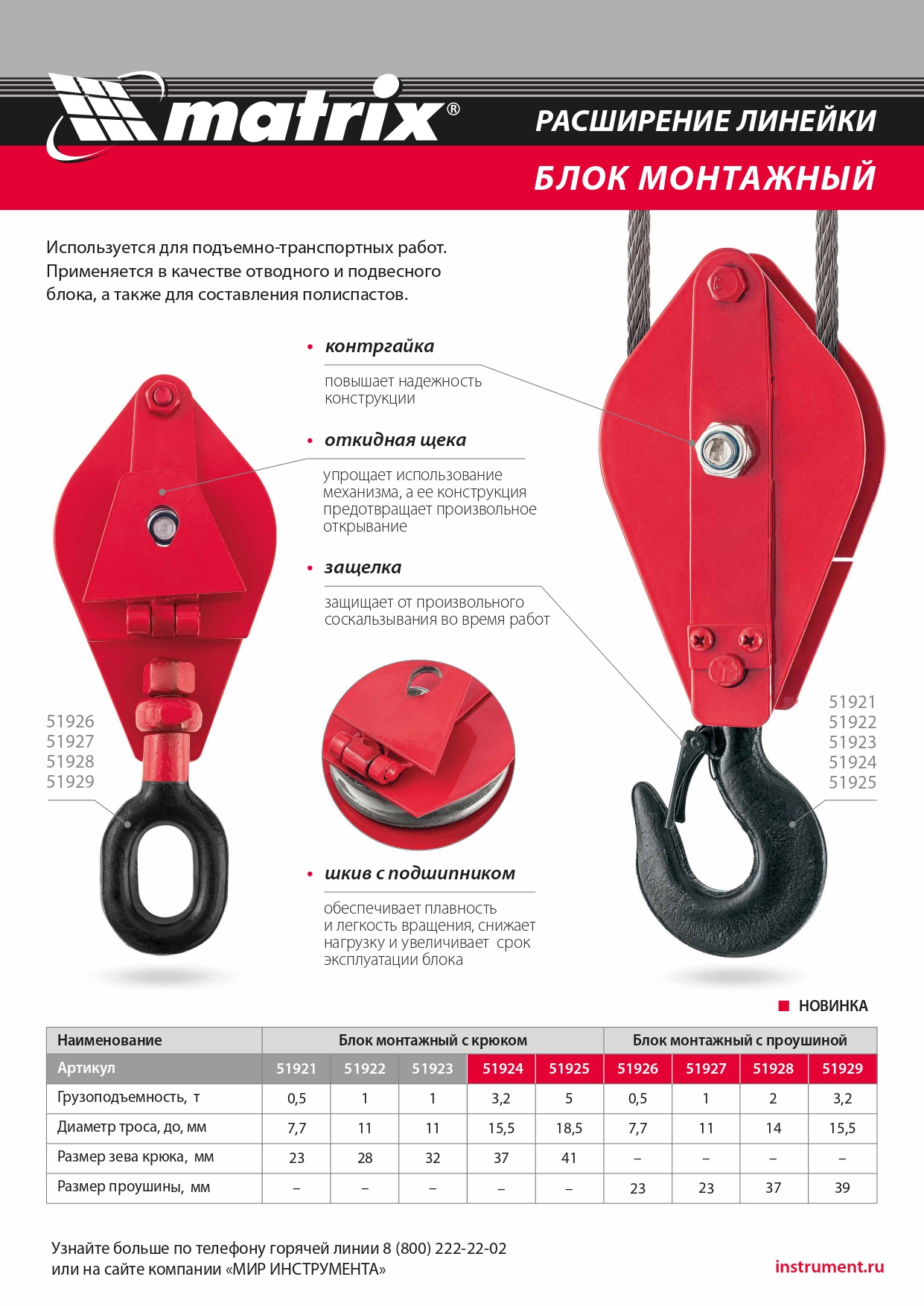 Монтажный блок Matrix 51921 с крюком, грузоподъемностью 0,5 т, расширяет функциональные возможности ручного и электрического грузоподъемного оборудования. Позволяет менять направление движения груза, а также увеличивает подъемную силу.