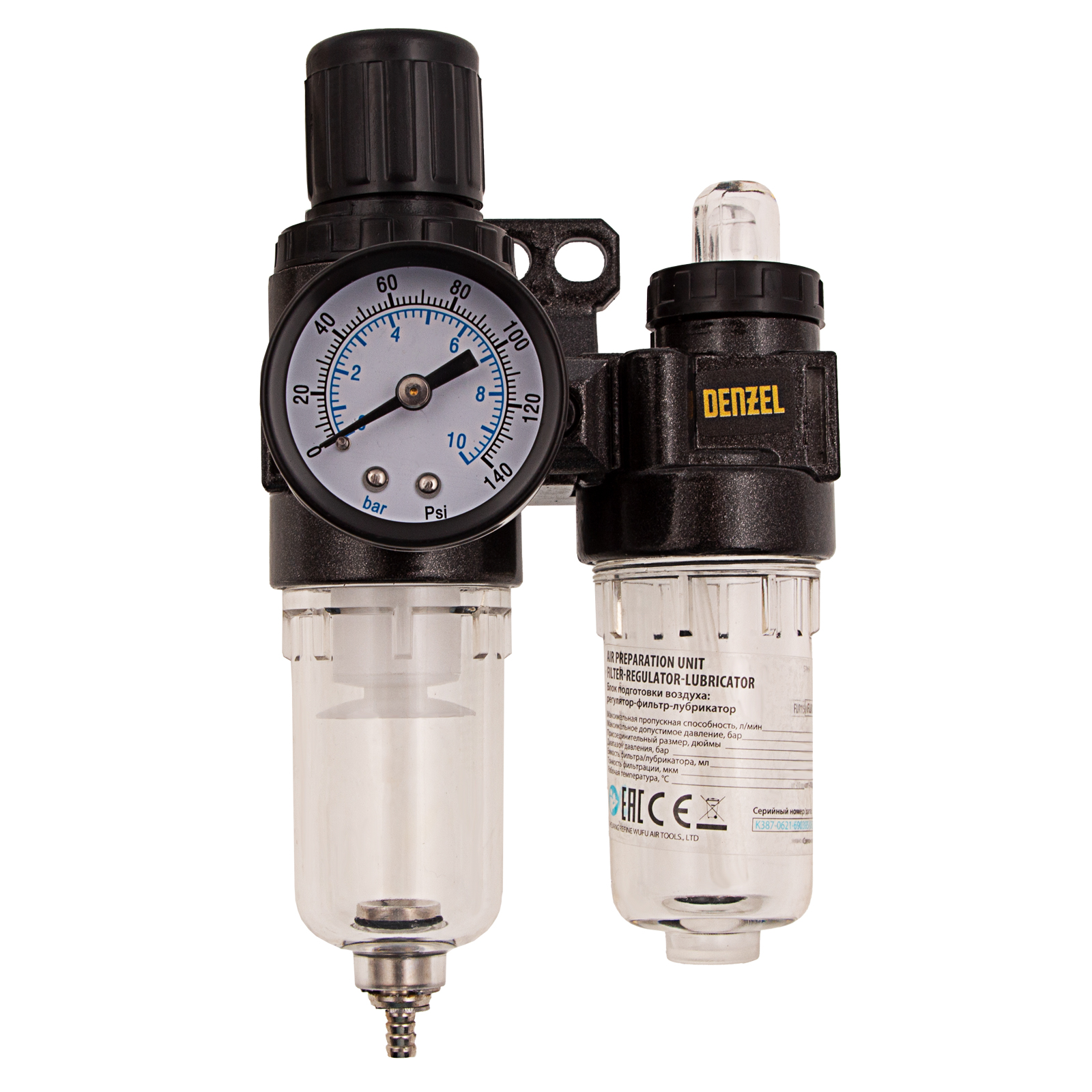 Блок подготовки воздуха Denzel FLR1500 57469 с фильтром-влагоотделителем, регулятором и лубрикатором, с присоединительным размером 1/4 дюйма, имеет пропускную способность 1500 л/мин, работает под давлением до 10 бар и позволяет увеличить срок службы пневматического инструмента.,Регулятор со встроенным манометром помогает контролировать и поддерживать заданное давление для корректной работы пневмоинструмента. Фильтр предназначен для очистки сжатого воздуха от конденсата и посторонних частиц размером от 40 мкм. Лубрикатор служит для подачи масла к пневмоинструменту. Блок используется совместно с компрессорами на строительной площадке, в мастерской, на производстве, в автосервисе, пригодится также в гараже.