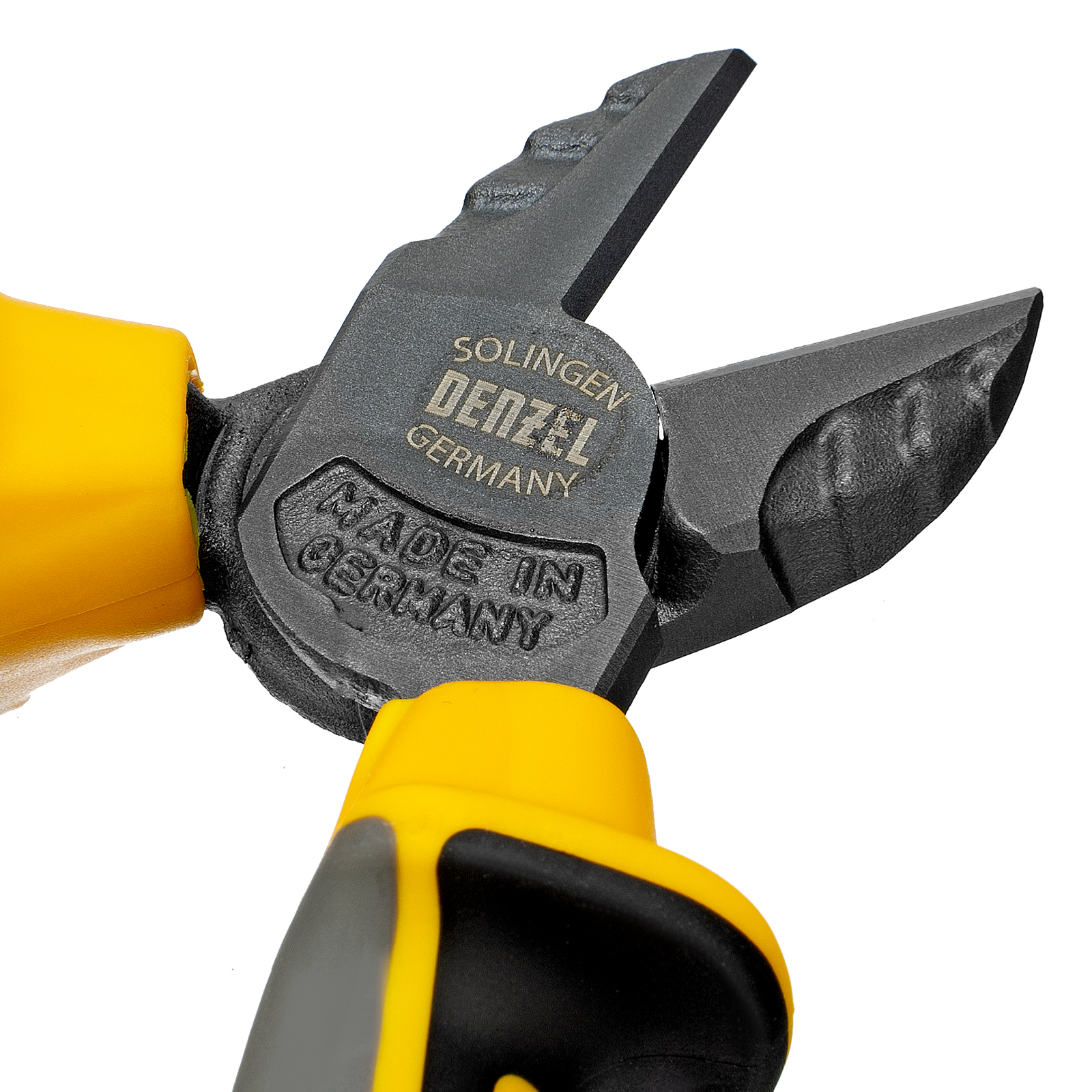 Бокорезы Denzel 17781 длиной 160 мм, с трехкомпонентными рукоятками, предназначены для разрезания кабелей из алюминия и меди, а также проволоки и стяжек. Максимальный диаметр перерезаемой мягкой проволоки (алюминиевой, медной, с пределом прочности 220 Н/мм2) составляет 6 мм, проволоки средней жесткости и гвоздей (750 Н/мм2) — 3,5 мм, жесткой (1800 Н/мм2) — 2 мм. Бокорезы используются для проведения слесарных и монтажных работ. Шарнир смещен к режущим кромкам, что позволяет сэкономить 20% усилий и максимально эффективно решать поставленные задачи.