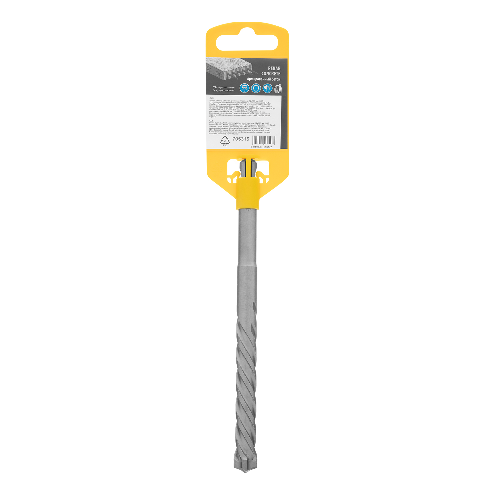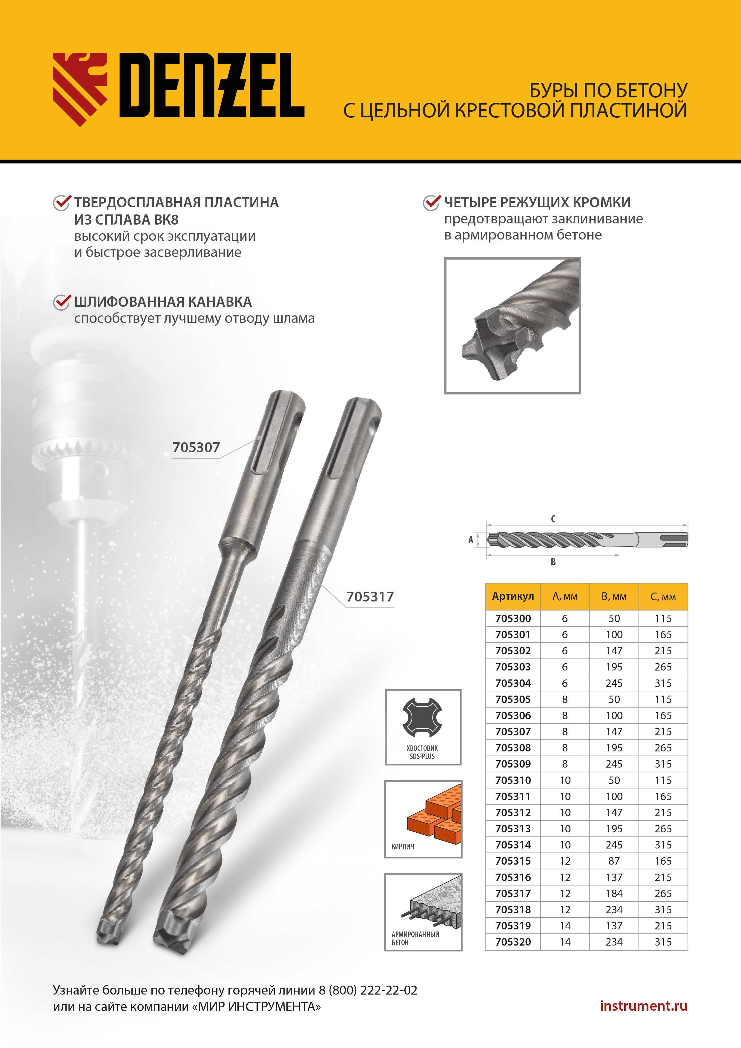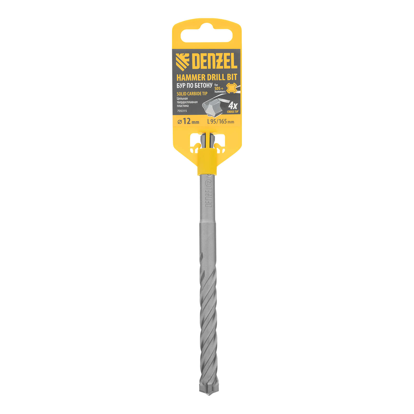 Бур по бетону Denzel 705315 длиной 165 мм, с цельной крестовой пластиной и хвостовиком SDS-plus — оснастка для перфораторов, предназначенная для получения отверстий диаметром 12 мм в бетоне, кирпиче, камне. Благодаря цельному карбидному наконечнику с 4 режущими кромками бур оптимален для работы с материалами высокой твердости, в том числе с армированным бетоном. Оснастка превосходит большинство аналогов по своим рабочим качествам и подходит для профессионального использования.