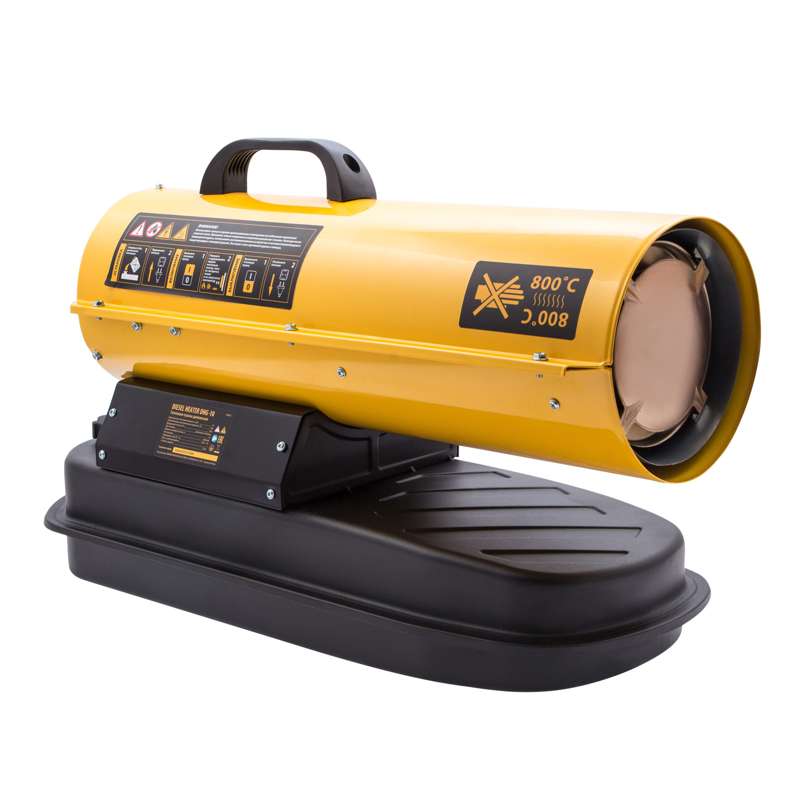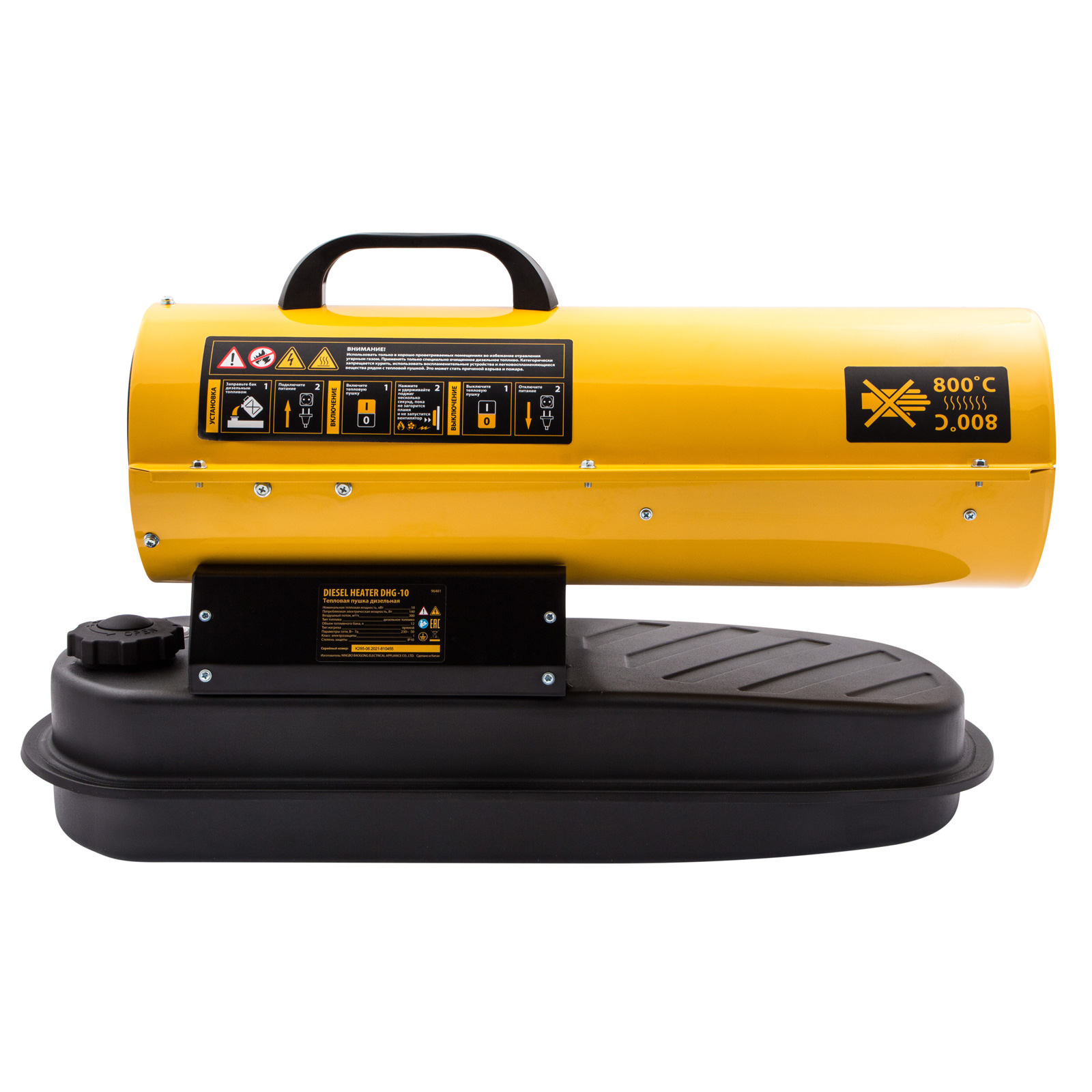 Дизельная тепловая пушка Denzel DHG-10 96481 мощностью 10 кВт и производительностью 300 м³/ч предназначена для прямого нагрева воздуха в цехах, ангарах, хранилищах и других нежилых помещениях с хорошей вентиляцией. Максимальная площадь обогрева составляет 100 м². Пушка служит эффективным источником тепла в полярных экспедициях. Пригодится также на строительной площадке для прогрева бетона, просушки стен и разморозки траншей. Для заправки может использоваться любое дизельное топливо: летнее, зимнее и арктическое. ,
