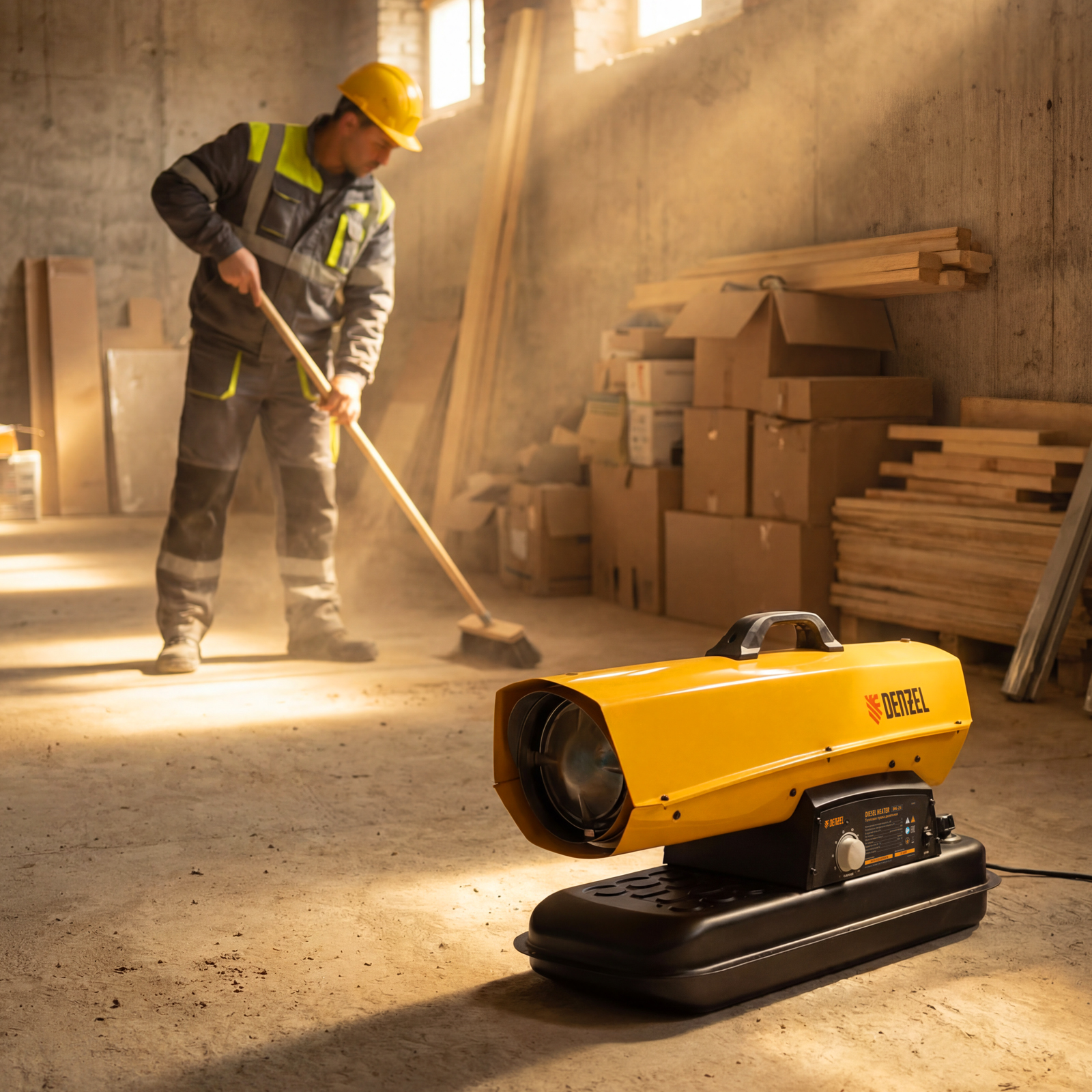 Дизельная тепловая пушка Denzel DHG-25i 96483 номинальной тепловой мощностью 25 кВт и производительностью 600 куб. м/ч, с прямым типом нагрева, с электронным термостатом, предназначена для обогрева цехов, складов, теплиц и других нежилых помещений. Используется в строительстве и на производстве. Пушка характеризуется низким расходом топлива: полного бака хватает на 10 часов работы. Важно: в обогреваемом помещении необходимо обеспечить хорошую вентиляцию.