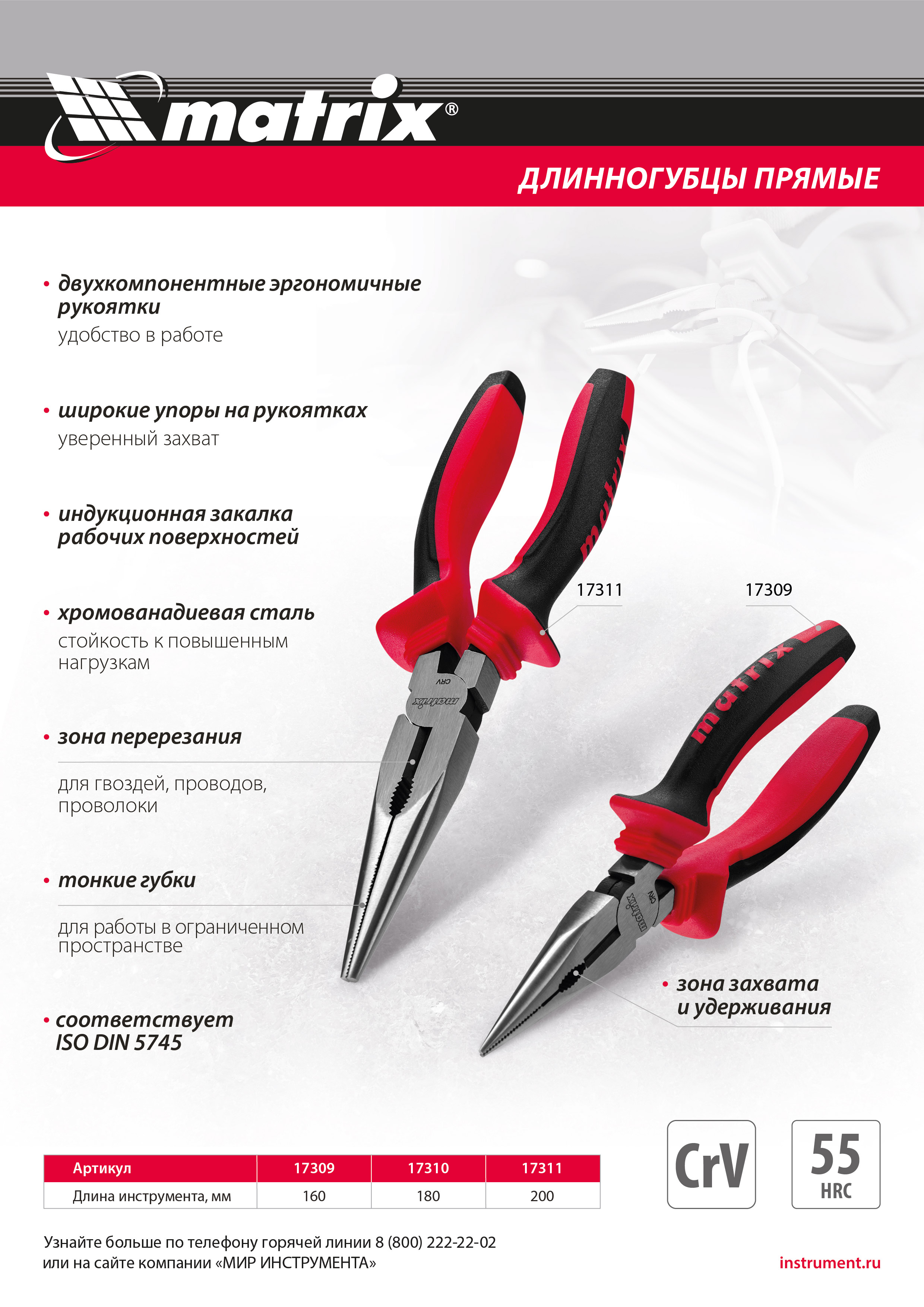 - Прочность и долговечность — длинногубцы изготовлены из стали 40 CrV, рабочие части прошли индукционную закалку до твердости 52-58 HRC.
