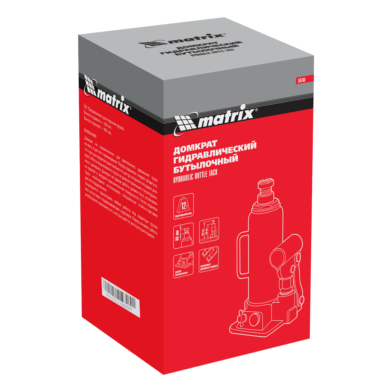 Гидравлический бутылочный домкрат Matrix 50768 предназначен для быстрого поднятия грузов массой до 12 т на высоту 230-465 мм. Будет полезен автолюбителям и мастерам СТО в качестве полупрофессионального инструмента. Встроенный магнитный уловитель металлической стружки защищает резиновые уплотнители от повреждений.