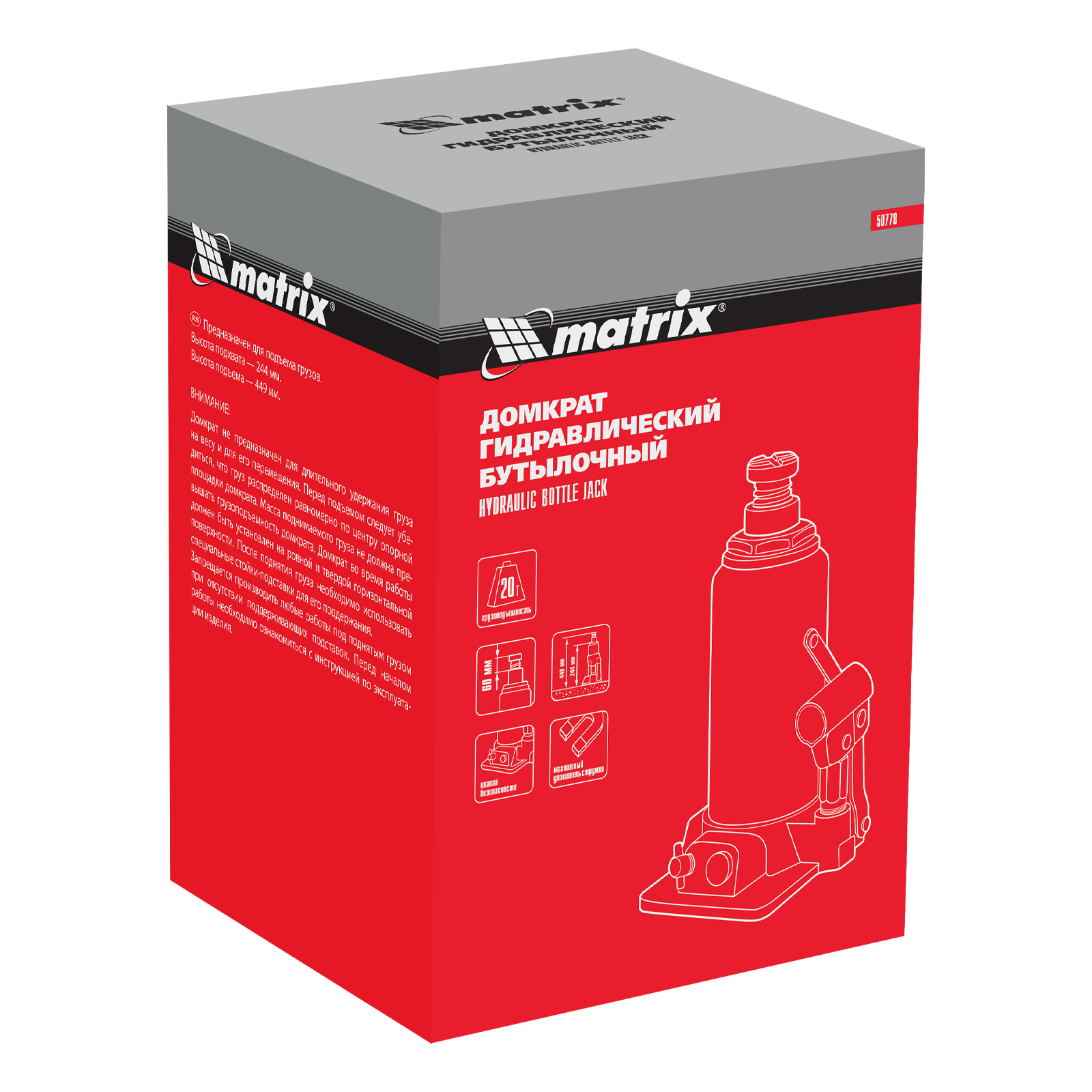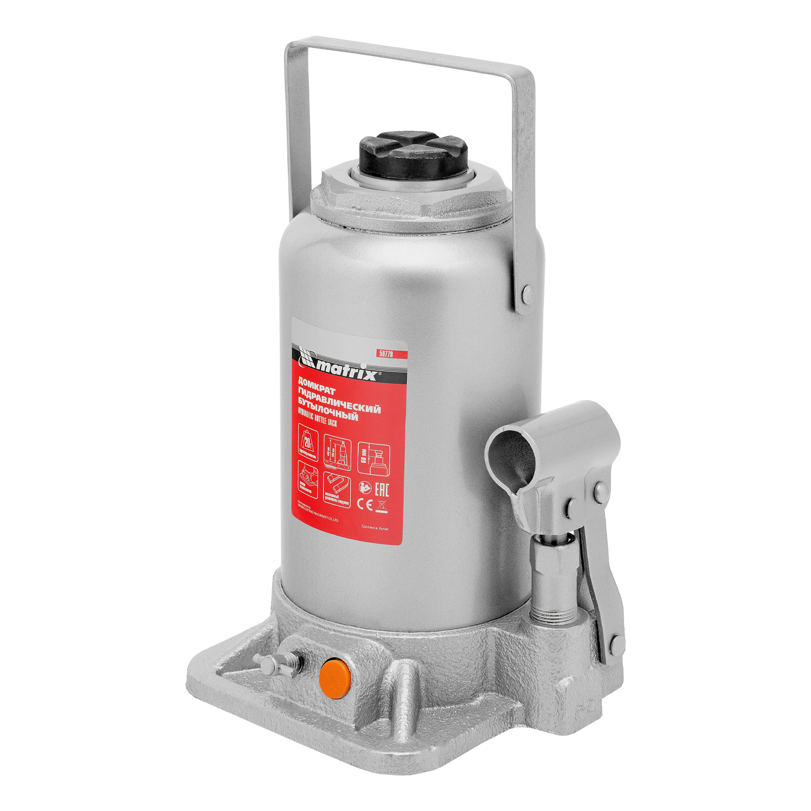 Гидравлический бутылочный домкрат Matrix 50778 поднимает грузы весом до 20 т на высоту 244-449 мм и может использоваться в гараже, на станции ТО или строительной площадке. Встроенный магнитный уловитель собирает металлическую стружку, образующуюся в процессе работы, что защищает домкрат от преждевременного износа.