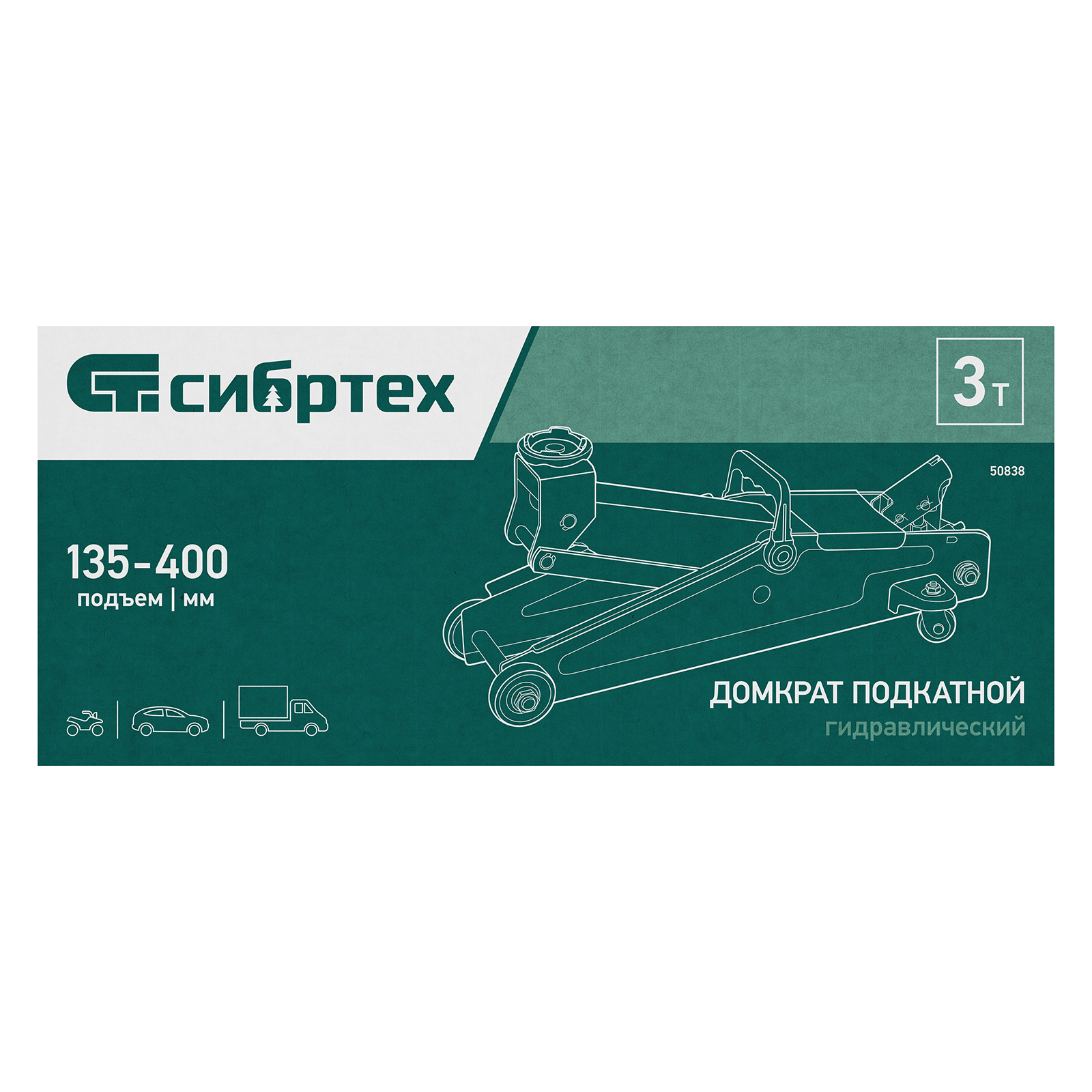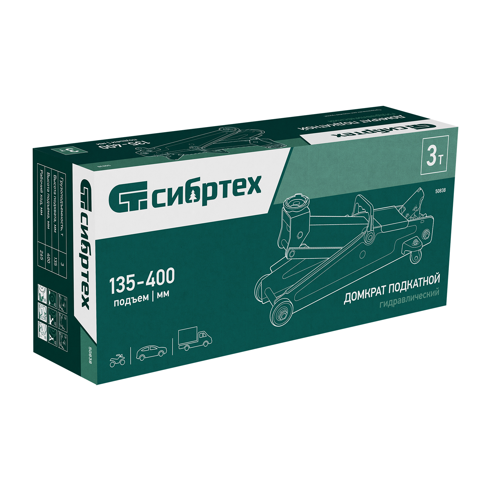 Гидравлический подкатной домкрат Сибртех 50838 с высотой подхвата 135 мм, предназначен для подъема грузов массой до 3 т на высоту до 400 мм. Применяется для обслуживания автомобилей со стандартным клиренсом. Компактный домкрат подходит для самостоятельного использования автовладельцами.