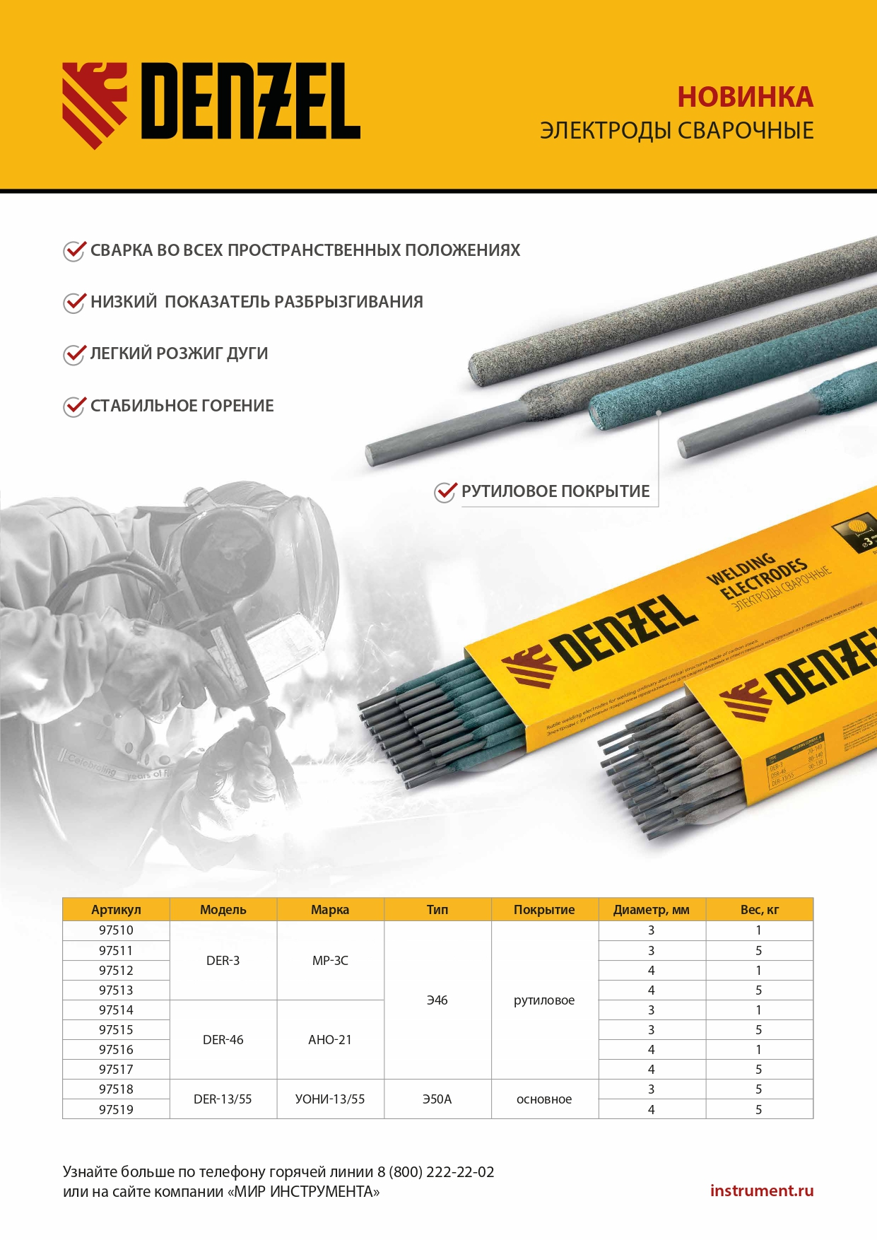 Электроды DER-46, диам. 3 мм, 5 кг, рутиловое покрытие Denzel в Москве