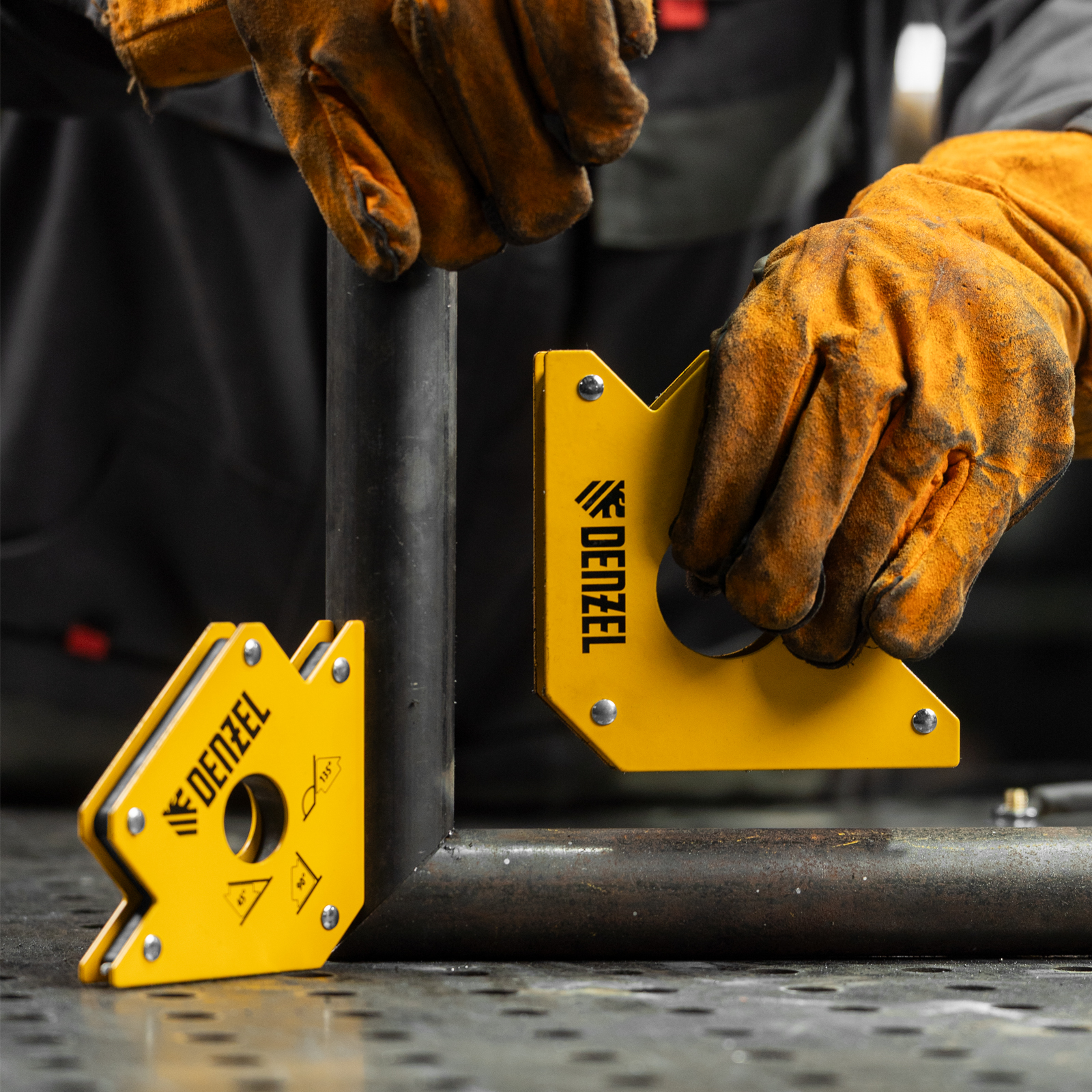 Фиксатор магнитный Denzel 97560 выдерживает усилие 75 LB (34 кг) и используется при проведении сварочных работ. Надежно фиксирует детали разного размера под углом 45°, 90° и 135° без риска их смещения или падения.