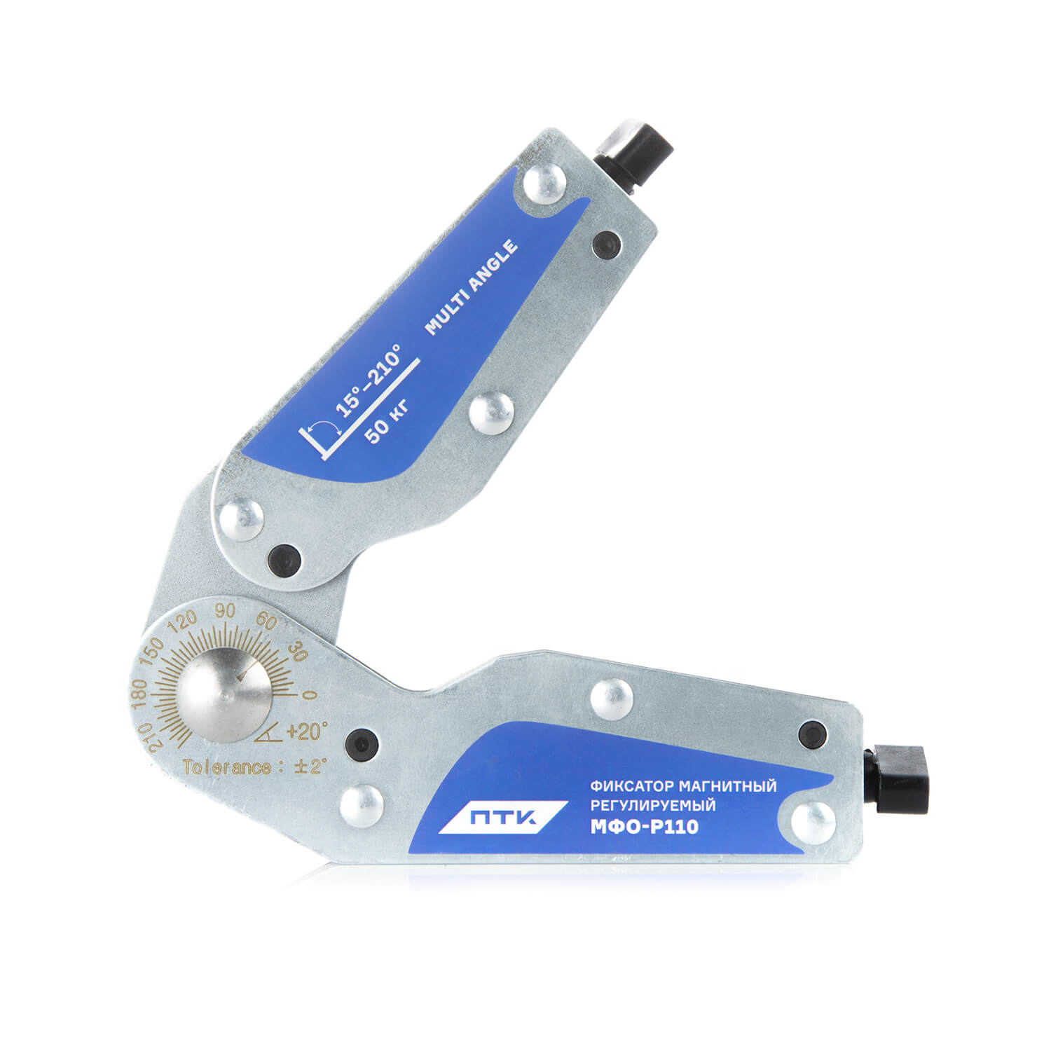 Магнитный фиксатор позволяет производить точное выставление углов в процессе сварки, пайки и монтаже конструкций с погрешностью 2°. МФО-Р110 позволяет регулировать угол от 15° до 210°.