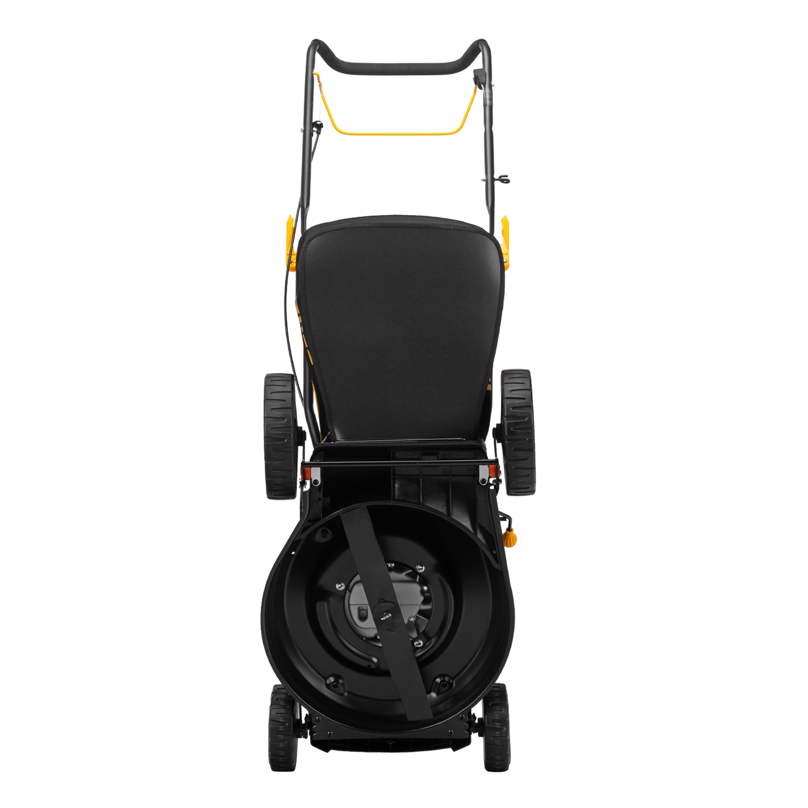 - Высокая эффективность — усиленный стальной корпус, закаленный до твердости 45 HRC нож и колеса увеличенного диаметра обеспечивают лучшее втягивание травы и свободную проходимость без повреждения газона.
