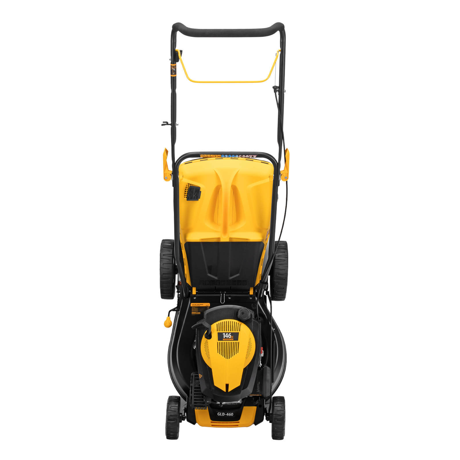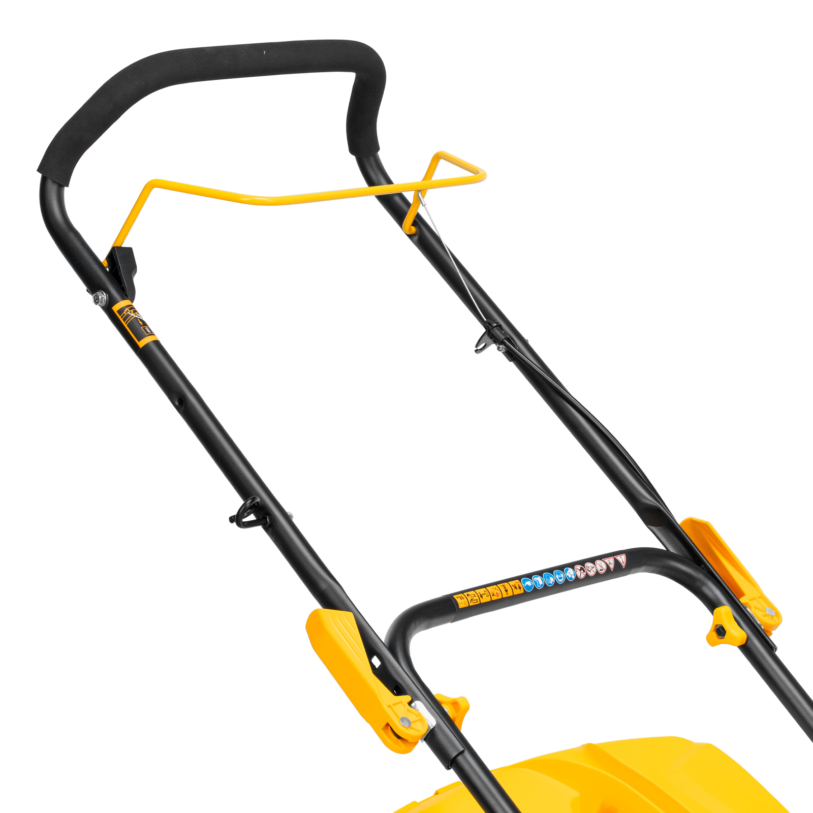 - Быстрая настройка — эксцентриковые фиксаторы ручки позволяют оперативно перевести газонокосилку в рабочее или транспортировочное положение, а 3 точки крепления обеспечивают регулировку вылета ручки под рост пользователя.