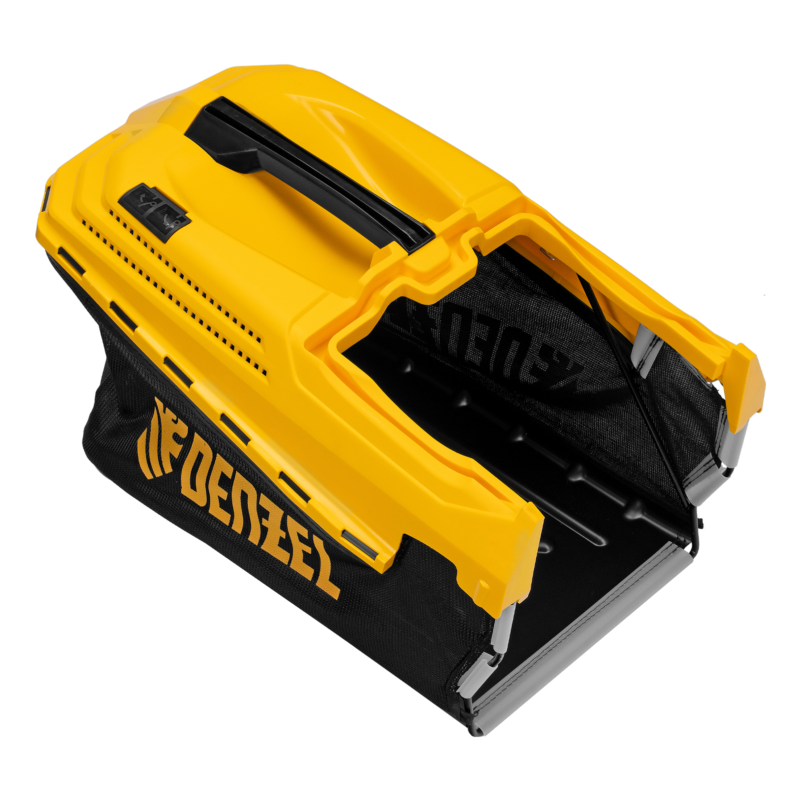 - Комбинированный травосборник — сочетание прочного пластика и легкой ткани значительно увеличивает надежность контейнера, облегчает его очистку и исключает гниение собранной травы.