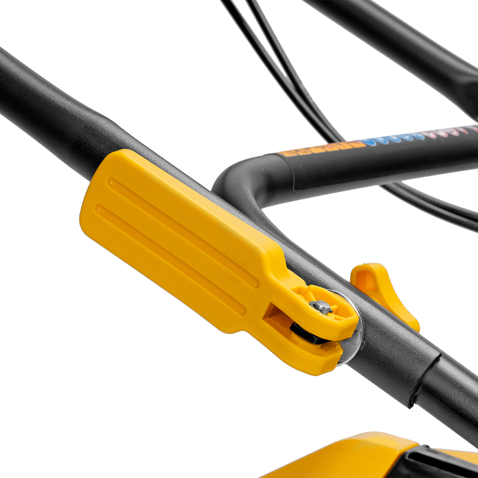 - Удобная система складывания — эксцентриковые фиксаторы быстро сжимаются и разжимаются, что позволяет за несколько минут сложить рукоятку и разместить косилку в нужном месте.