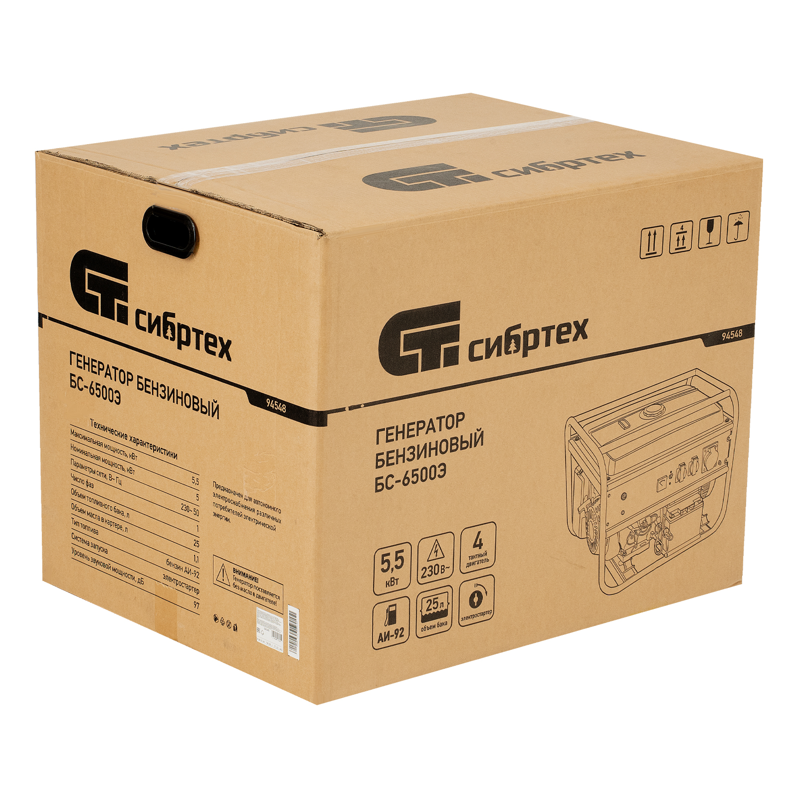 Генератор бензиновый БС-6500Э, 5.5 кВт, 230В, четырехтактный, 25 л, электростартер Сибртех в Москве