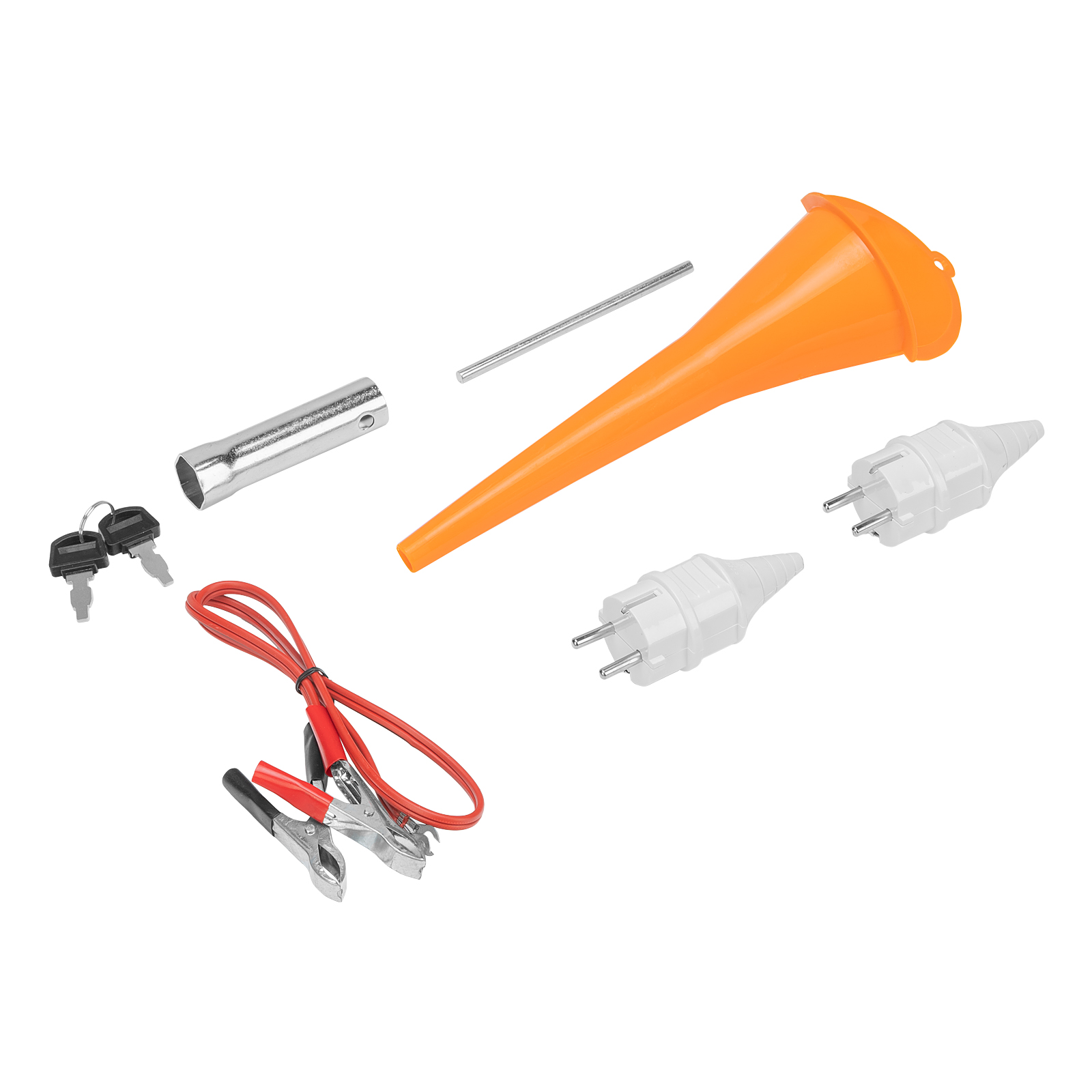 - Полная готовность к работе — в комплект входят аккумулятор, свечной ключ, 2 вилки 230В/16А и 2 ключа зажигания.