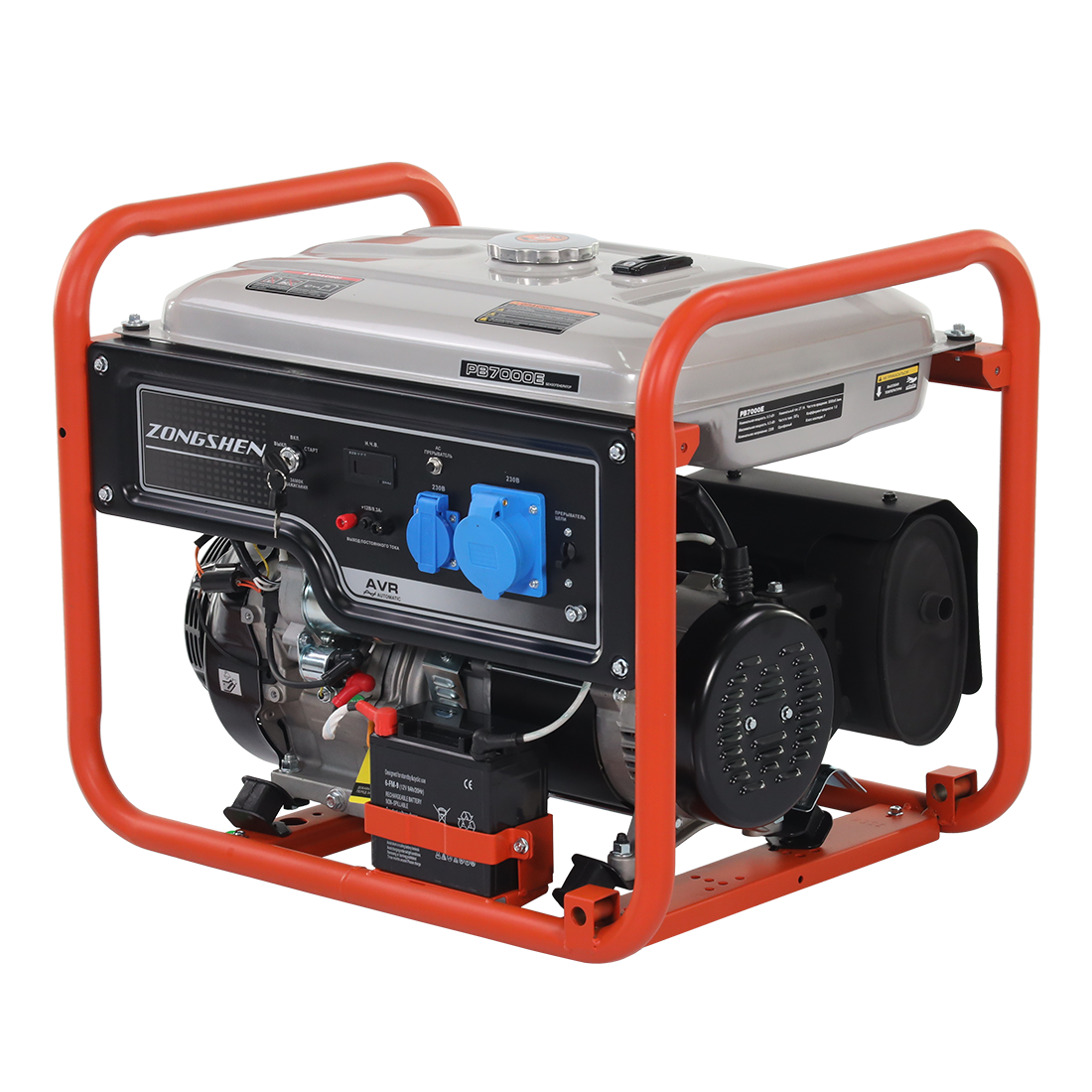 Бензиновый генератор с электрозапуском Zongshen PB 7000 E. Данный генератор относится к однофазным генераторам. Однофазный бензогенератор Zongshen PB 7000E оснащен регулятором напряжения AVR, который обеспечивает стабильное выходное напряжение. На корпусе бензогенератора установлено две розетки для подключения потребителей.