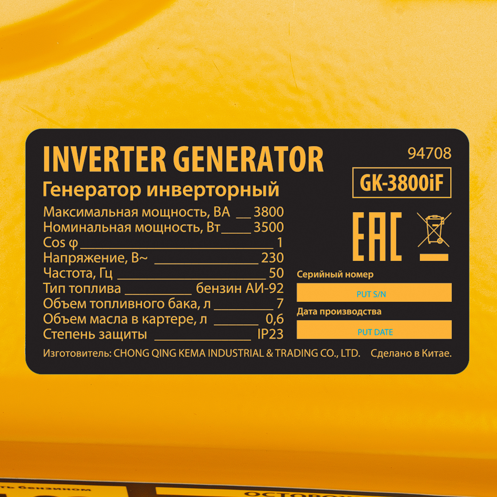 Генератор инверторный GK-3800iF, 3,8 кВт, 230 В, ручной старт DENZEL в Москве