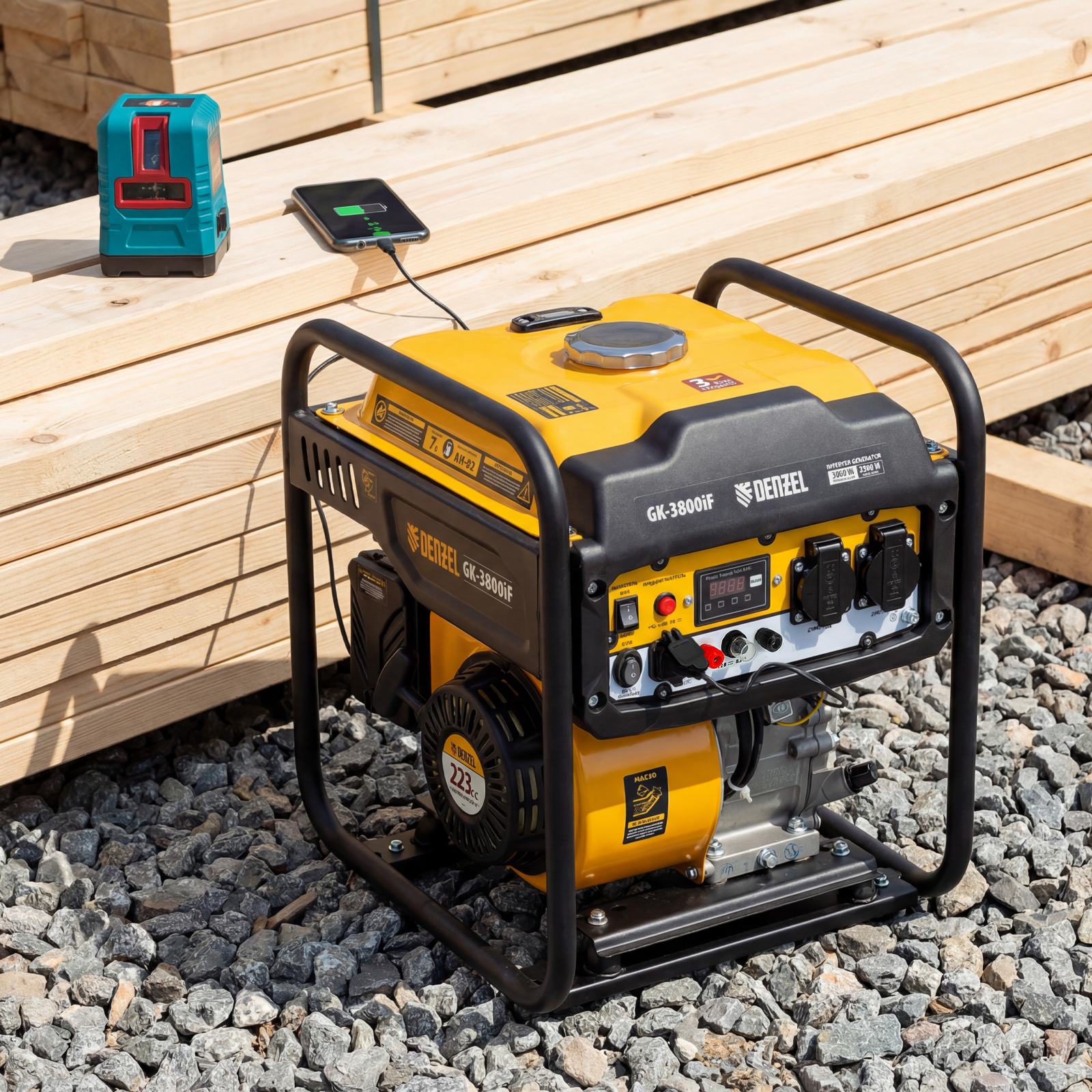 Инверторный генератор Denzel GK-3800iF 94708 максимальной мощностью 3,8 кВт, с ручным стартом, поддерживает напряжение 230 В и предназначен для питания осветительных приборов, бытовой техники, электроинструмента и т.д. в условиях отсутствия электросети или перебоев в ее работе. Обеспечивает подачу стабильного тока, подходит для подключения потребителей, чувствительных к качеству электроэнергии: газовых котлов, серверных станций, цифровой техники. Предусмотрена возможность подключения мобильных устройств к выходу USB 5 В. Клеммы постоянного тока 12 В можно использовать для зарядки автомобильных аккумуляторов. Генератор незаменим на дачном участке.