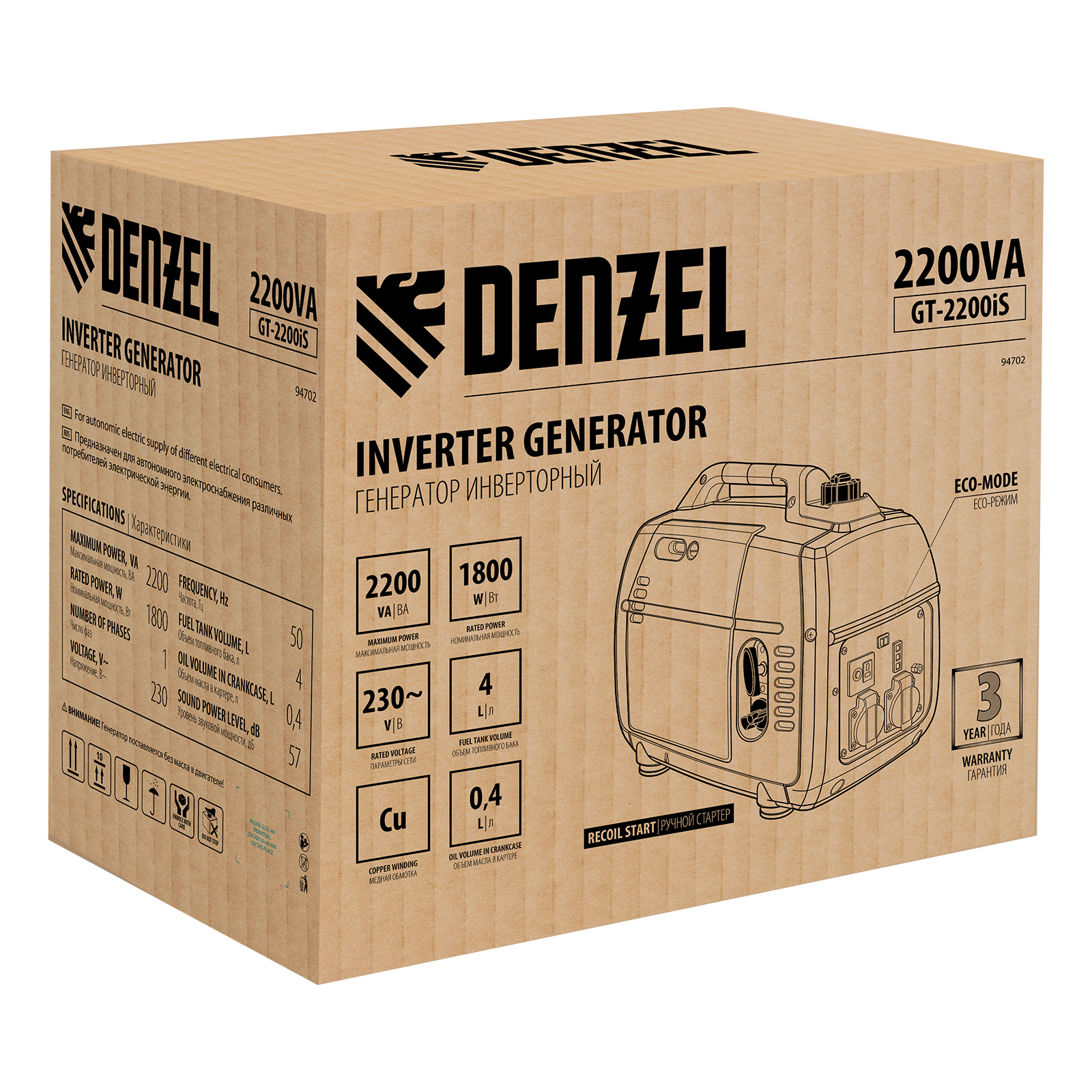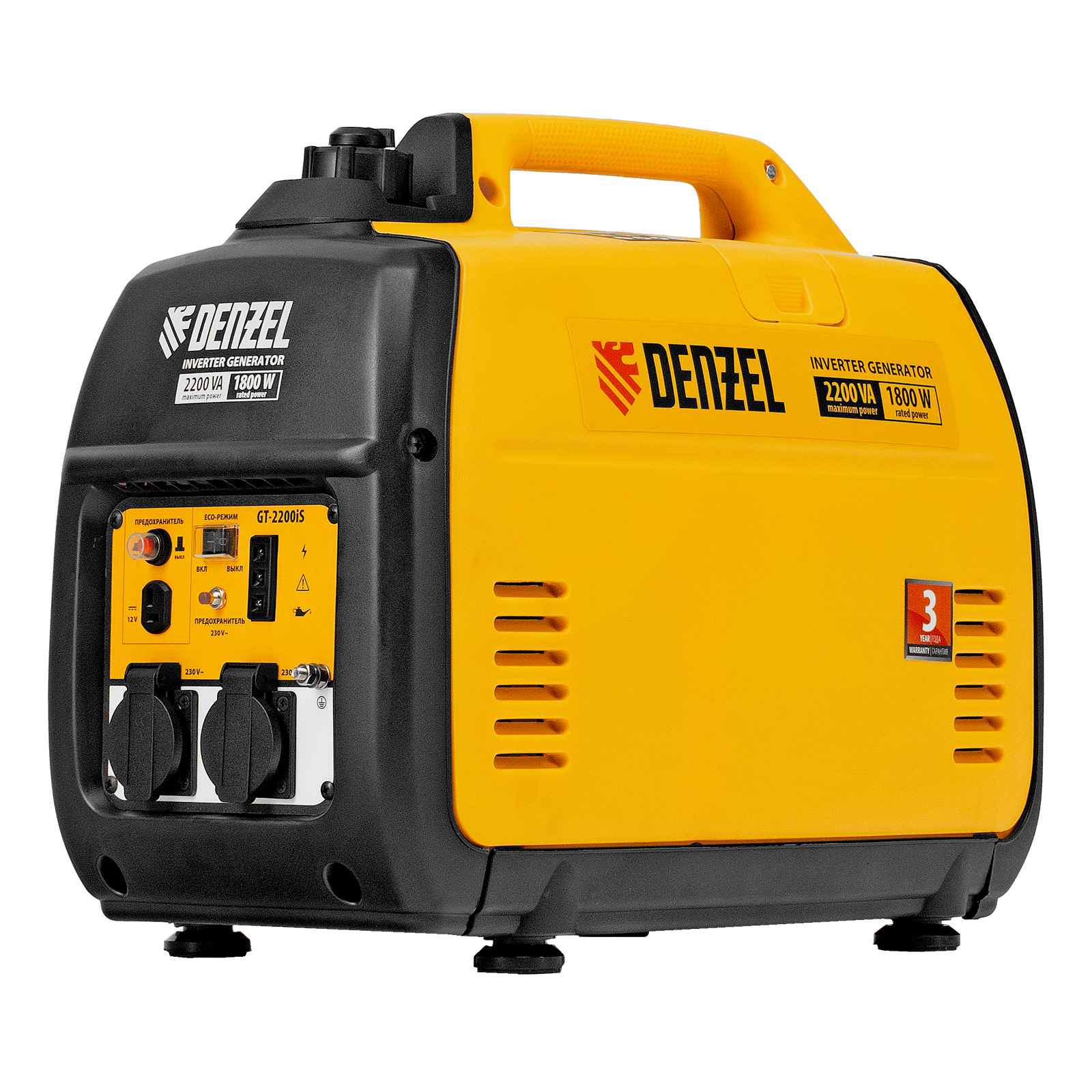 Инверторный генератор Denzel GT-2200iS 94702 мощностью 2,2 кВт, в закрытом корпусе, с ручным стартом, — легкий и экономичный, но при этом достаточно мощный, с ним легко справится даже неопытный пользователь. Идеально подходит для выездов на природу и рыбалку, но также будет незаменим на дачном участке и в торговой палатке. Четырехтактный двигатель мощностью 3,2 л.с. и объемом 113 куб. см работает стабильно и имеет небольшой уровень шума 57 дБ.