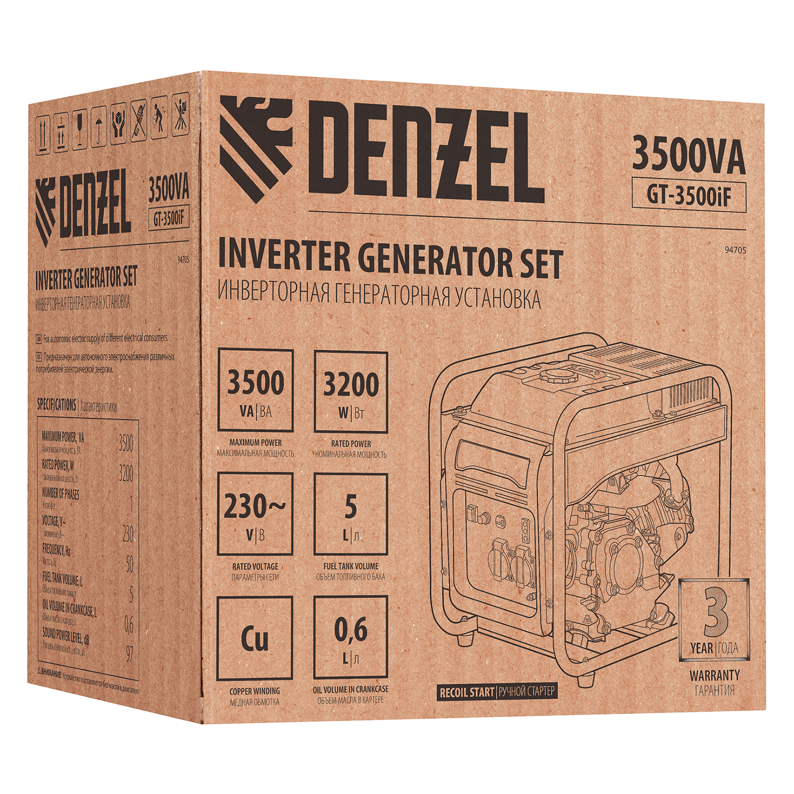 Инверторный генератор Denzel GT-3500iF 94705 мощностью 3,5 кВт, в открытом корпусе, с ручным стартом, — легкий и экономичный, но при этом достаточно мощный, с ним легко справится даже неопытный пользователь. Идеально подходит для использования на даче, в гараже, в мастерской и на природе. Четырехтактный двигатель Denzel Long Life мощностью 7 л.с. и объемом 212 куб. см работает стабильно и имеет относительно невысокий уровень шума (97 дБ) и вибраций. Прочная рама защищает рабочие элементы от повреждений в процессе работы и транспортировки.