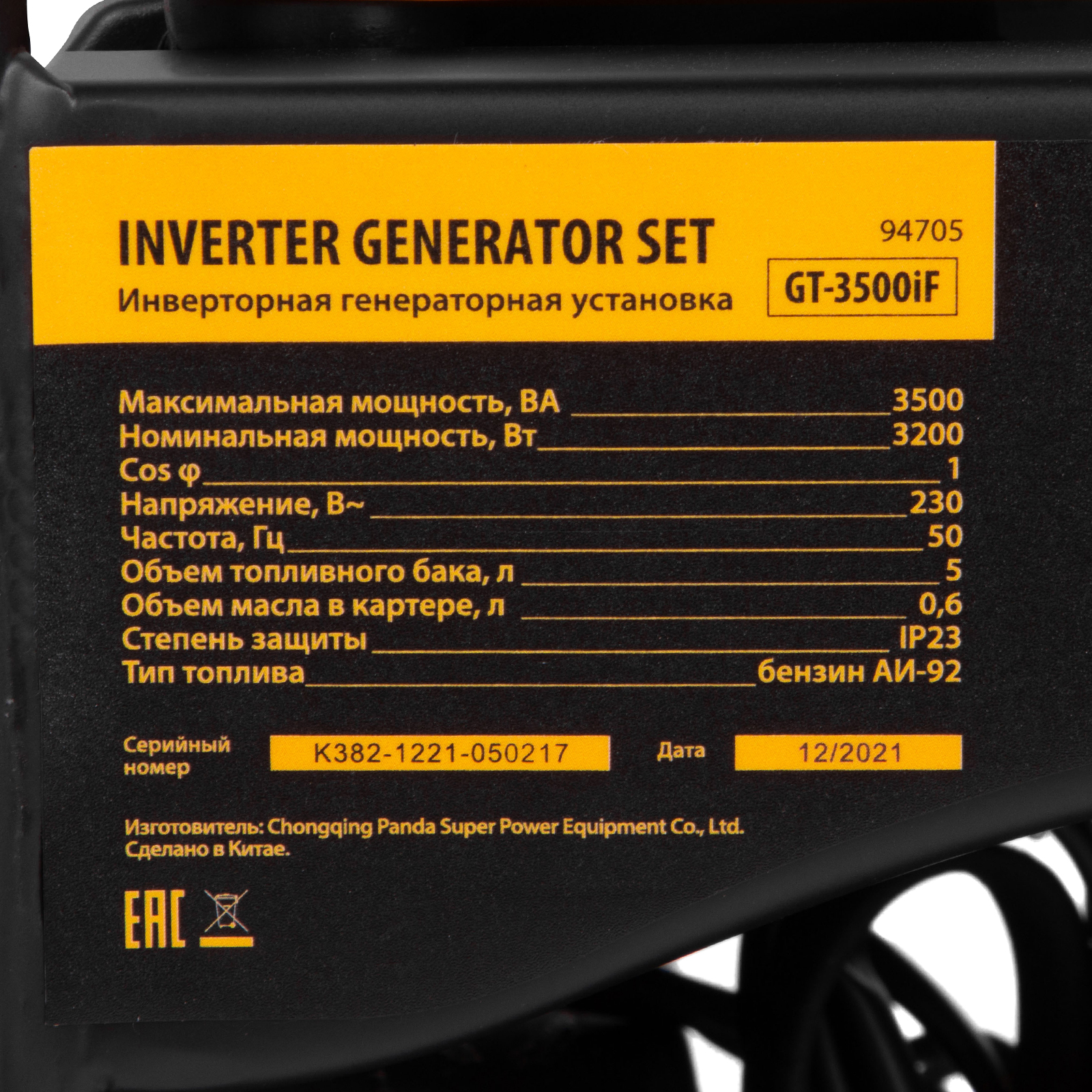 Генератор инверторный GT-3500iF, 3.5 кВт, 230 В, бак 5 л, открытый корпус, ручной старт Denzel в Москве