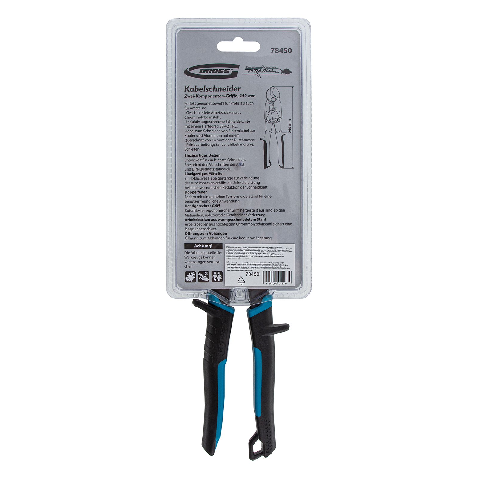 Кабелерез Gross «PIRANHA» 78450 длиной 240 мм, с двухкомпонентными рукоятками, используется для перерезания одножильных и многожильных кабелей диаметром до 14 мм и сечением до 14 кв. мм. Он пригодится частным мастерам и профессионалам при выполнении электромонтажных работ.