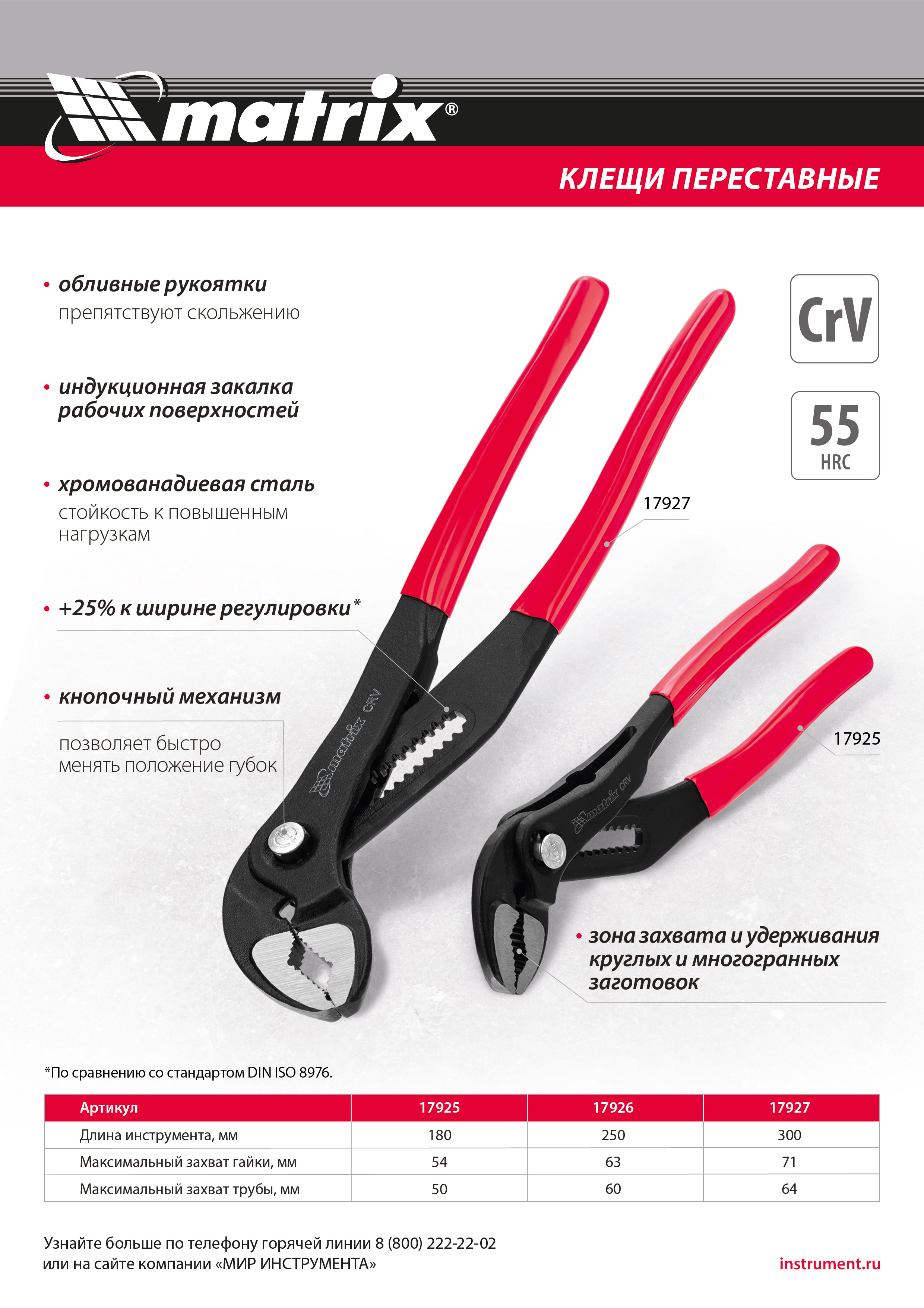 Переставные клещи Matrix 17925 длиной 180 мм, выполненные из хромованадиевой стали, с кнопочным механизмом и обливными рукоятками, используются для проведения монтажных и слесарных работ. Универсальный инструмент заменяет ключи различных размеров и применяется для фиксации заготовок, откручивания гаек, зажима и удержания труб диаметром до 50 мм.