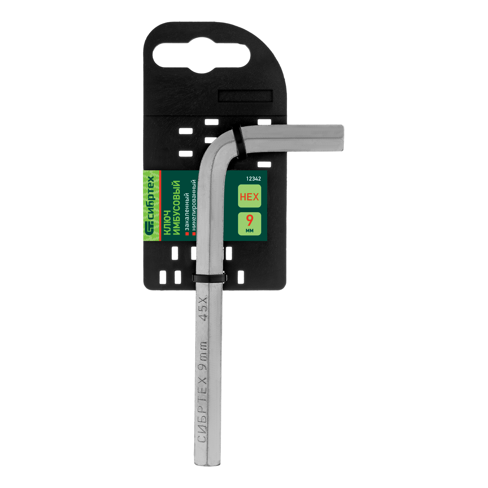 Ключ имбусовый никелированный Сибртех 12342 размером 9 мм, из закаленной стали 45Х, используется для монтажа и демонтажа резьбового крепежа с шестигранным шлицем HEX. Пригодится для сборки мебели, ремонта бытовой техники, велосипедов и автомобилей.