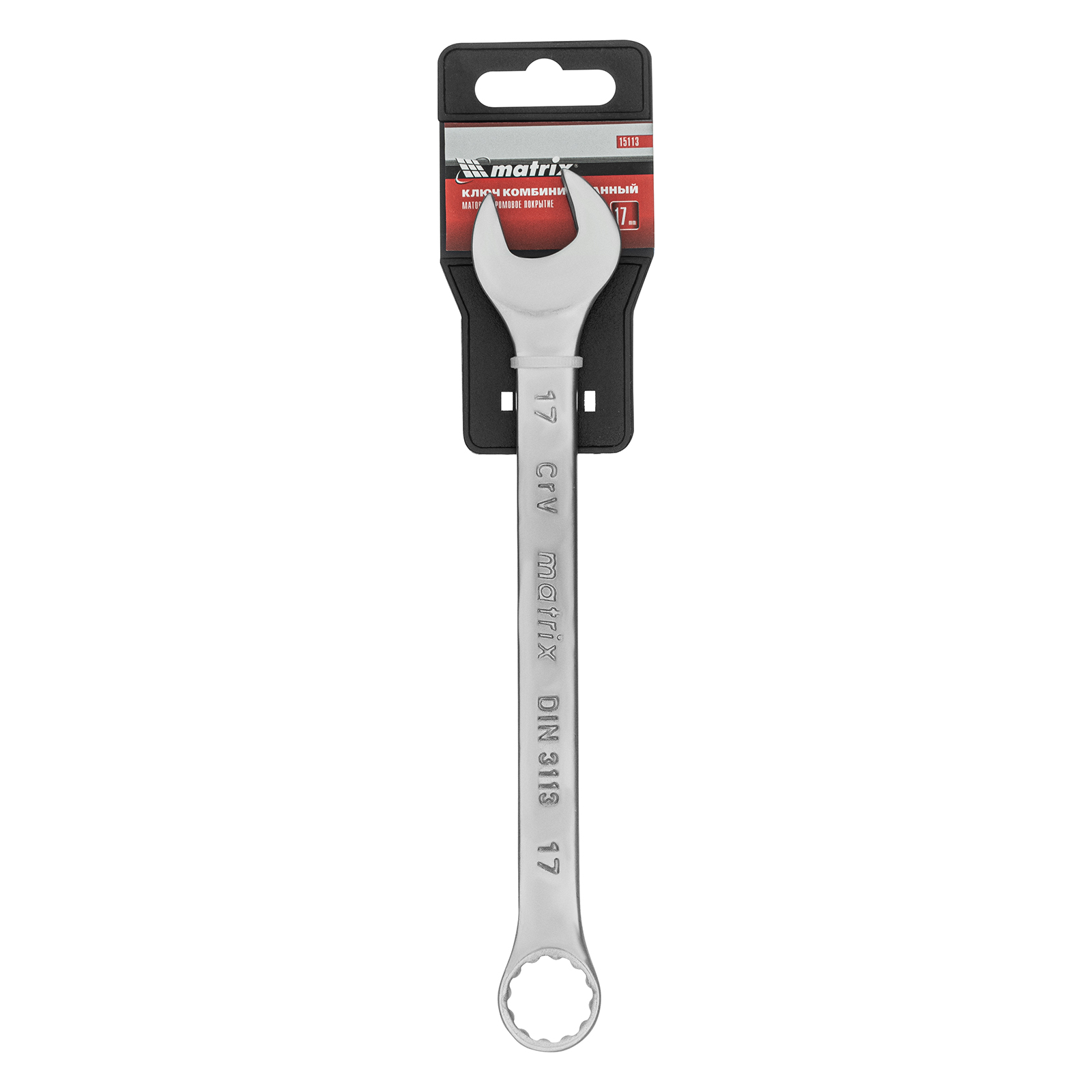 Комбинированный ключ Matrix 15113 размером 17 мм, из стали CrV, с покрытием «матовый хром», пригодится во время ремонтных работ дома или в гараже. С его помощью можно быстро монтировать и демонтировать крепежные элементы. Угол наклона кольцевого зева относительно плоскости инструмента составляет 15°, поэтому ключом удобно работать в труднодоступных местах.