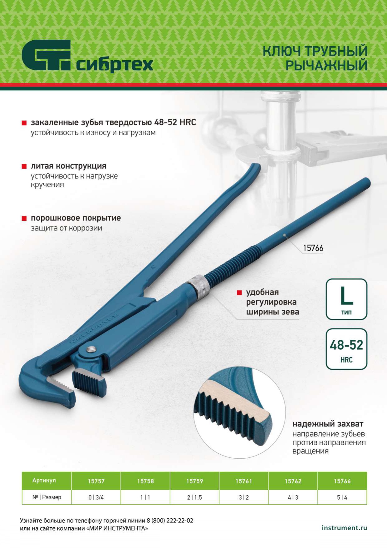 Литой трубный рычажный ключ Сибртех №0 15757, тип «L», используется для захвата и вращения труб диаметром 3/4", а также других деталей со специальным профилем и без него. Рычажный механизм увеличивает рабочее усилие, снижая нагрузку на руки мастера. Инструмент рассчитан на бытовое и профессиональное применение.