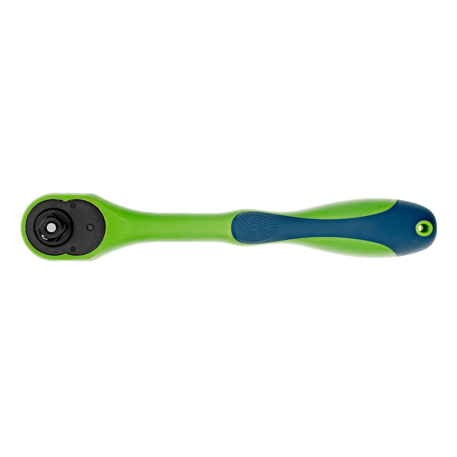 Ключ-трещотка Сибртех 14009 с двухкомпонентной рукояткой и присоединительным квадратом 1/2" используется с торцевыми головками, имеющими посадочное гнездо соответствующего размера. Предназначен для закручивания и раскручивания резьбовых соединений. Храповой механизм с 72 зубцами обеспечивает плавное вращение. Ключ применяется для ремонта автомобилей, техники и оборудования, а также пригодится дома или на даче.