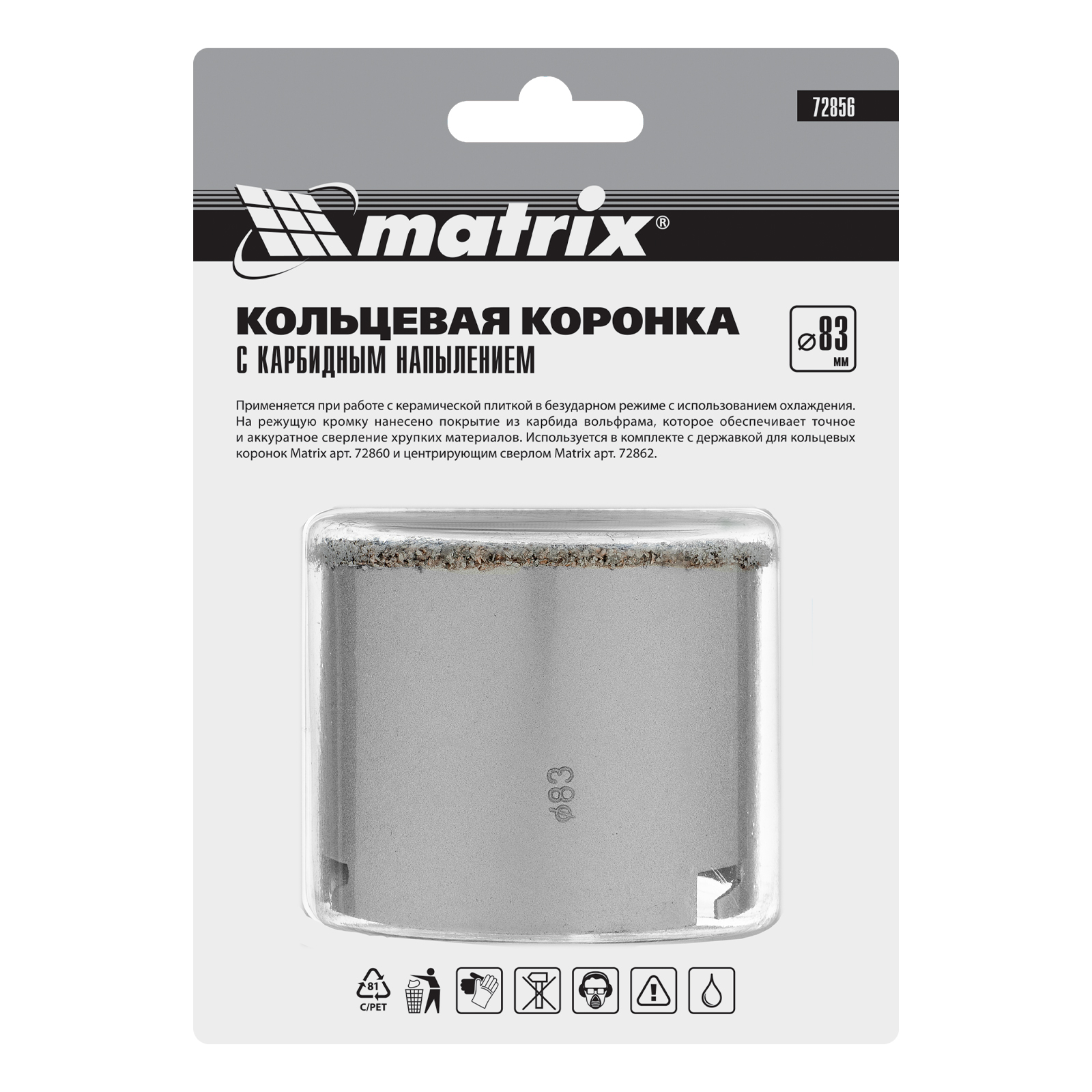Кольцевая коронка с карбидным напылением Matrix 72856 диаметром 83 мм — сменный режущий элемент для дрелей и перфораторов. Предназначена для сверления отверстий в керамической плитке, ячеистом бетоне, пенобетоне, газосиликате, кирпиче. Пригодится для монтажа проводки в доме. Используется совместно с державкой Matrix 72860 и центрирующим сверлом Matrix 72862 (не входят в комплект поставки).