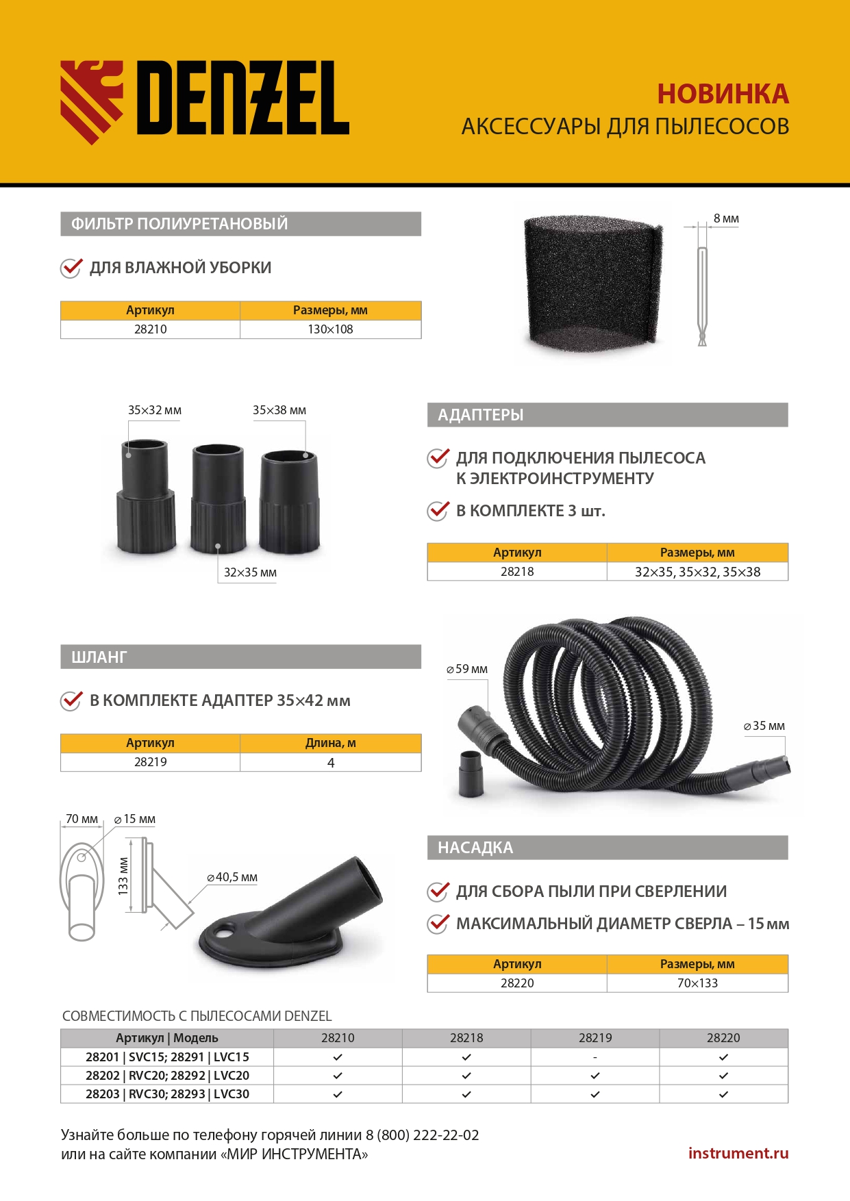 Комплект адаптеров Denzel 28218 включает 3 переходника размером 35 х 32 мм, 32 х 35 мм, 35 х 38 мм и служит для подключения пылесоса к электроинструменту. Такое решение позволяет обеспечить мгновенное удаление пыли, образующейся в процессе сверления, пиления, фрезерования.