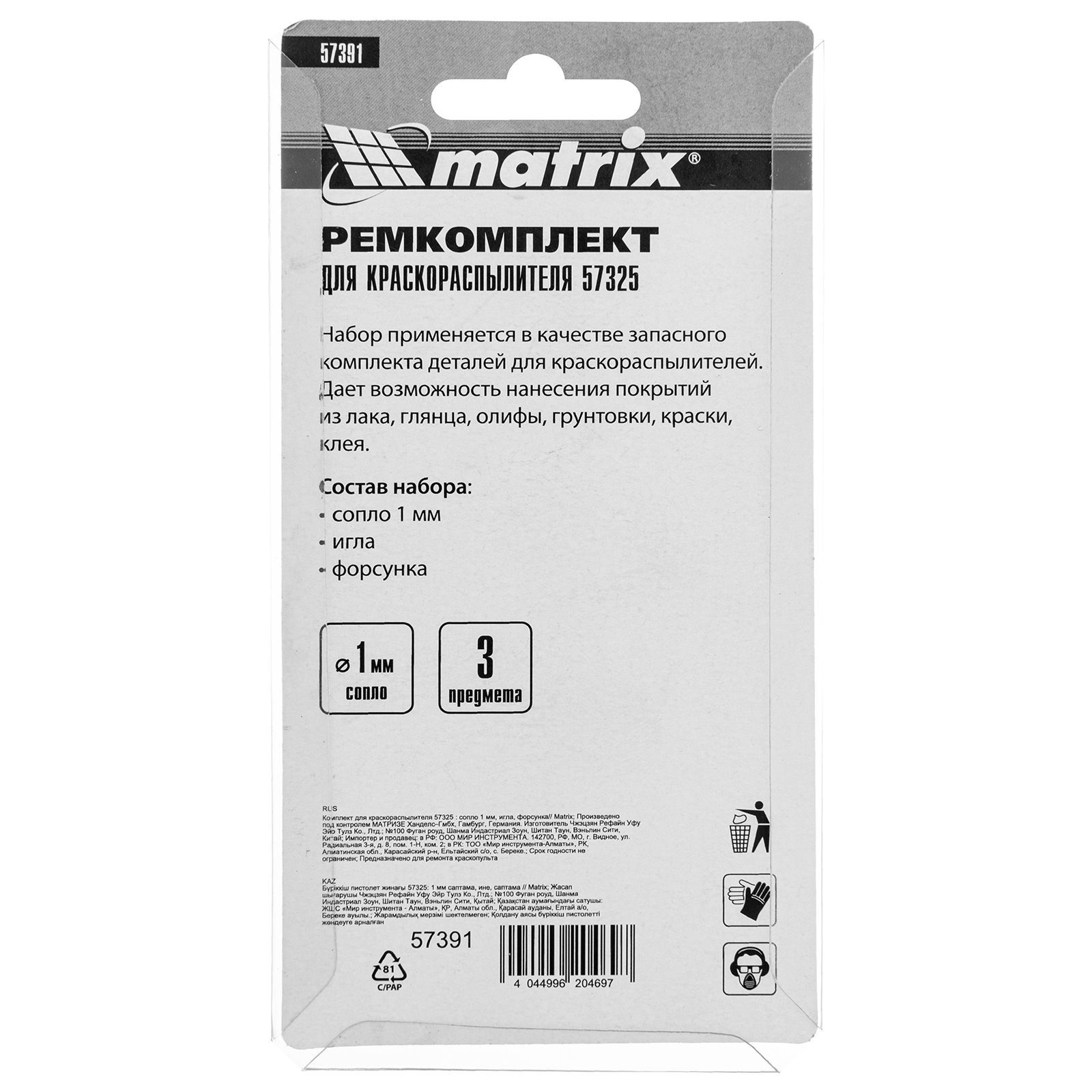 Комплект Matrix 57391 для краскораспылителя Matrix 57325 включает в себя 3 предмета: сопло диаметром 1 мм, иглу и форсунку. Их можно использовать для ремонта инструмента или расширения его функциональных возможностей.