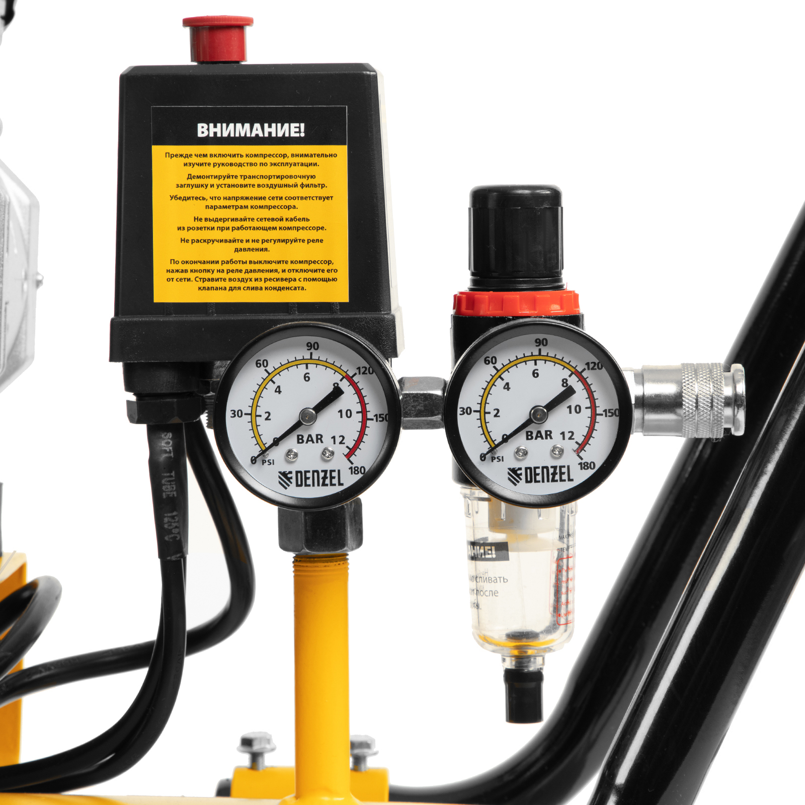 - Контроль давления в ресивере и на выходной магистрали — компрессор оборудован двумя манометрами.