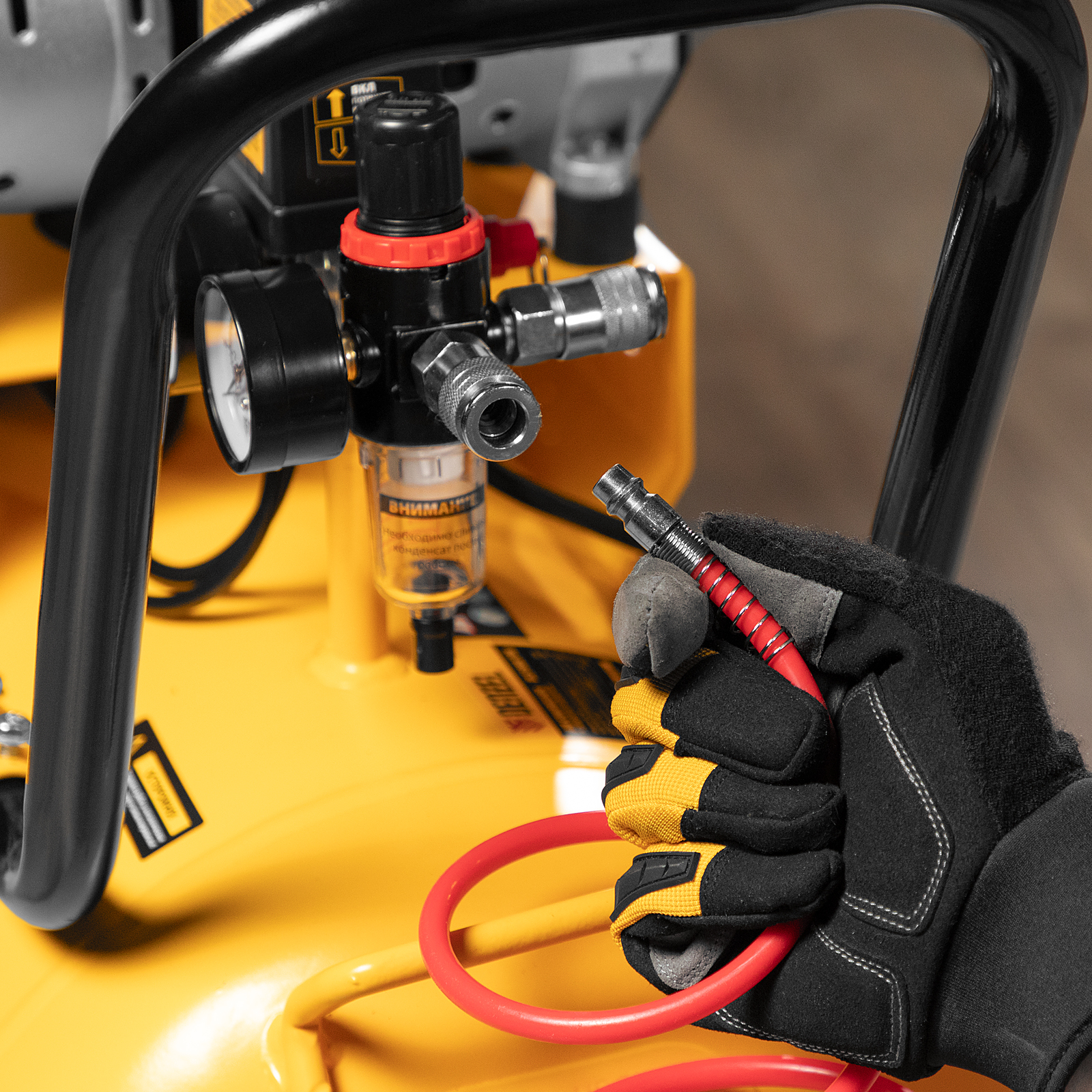 - Простая подготовка к работе — благодаря быстросъемному выходному коннектору подключение пневмоинструмента занимает несколько секунд.