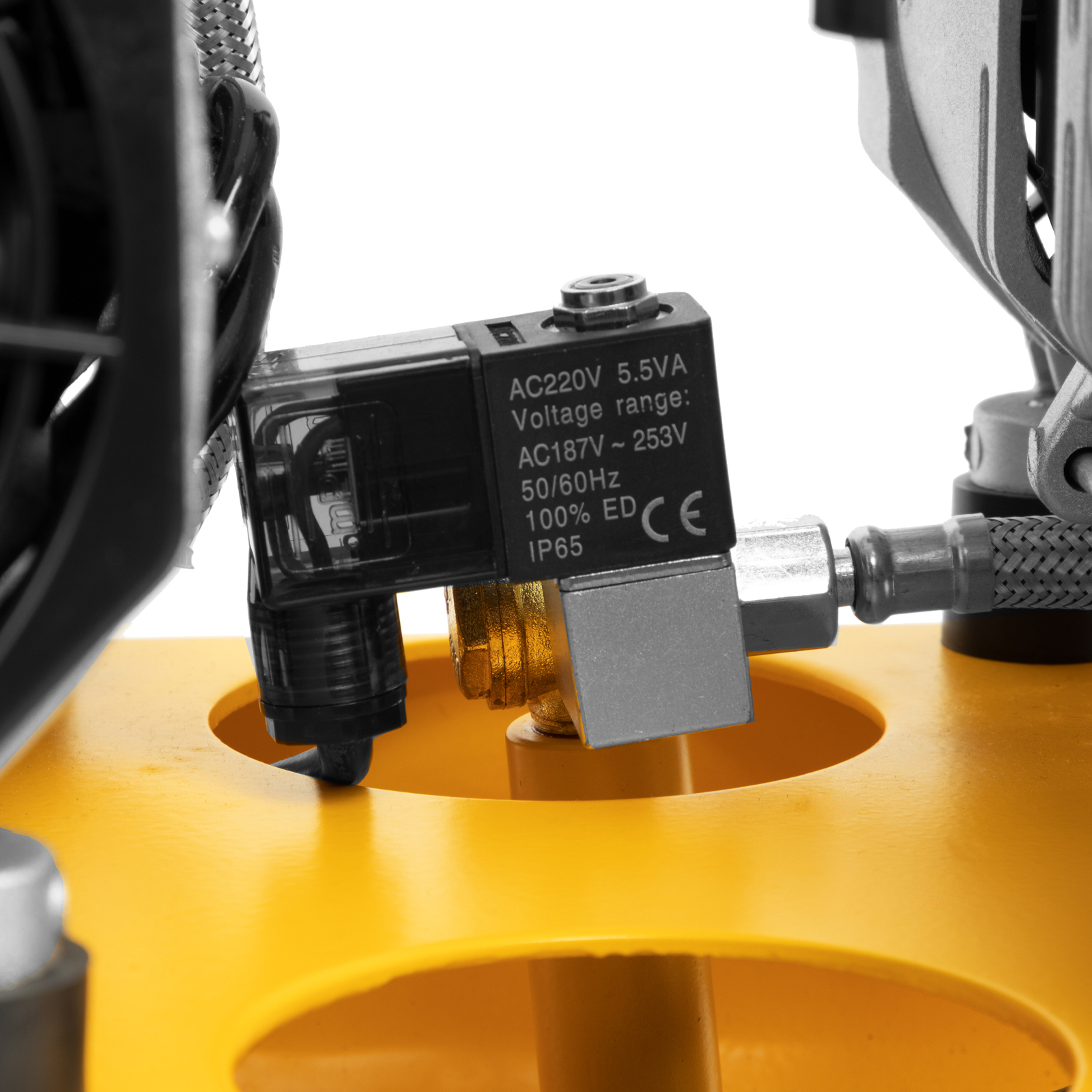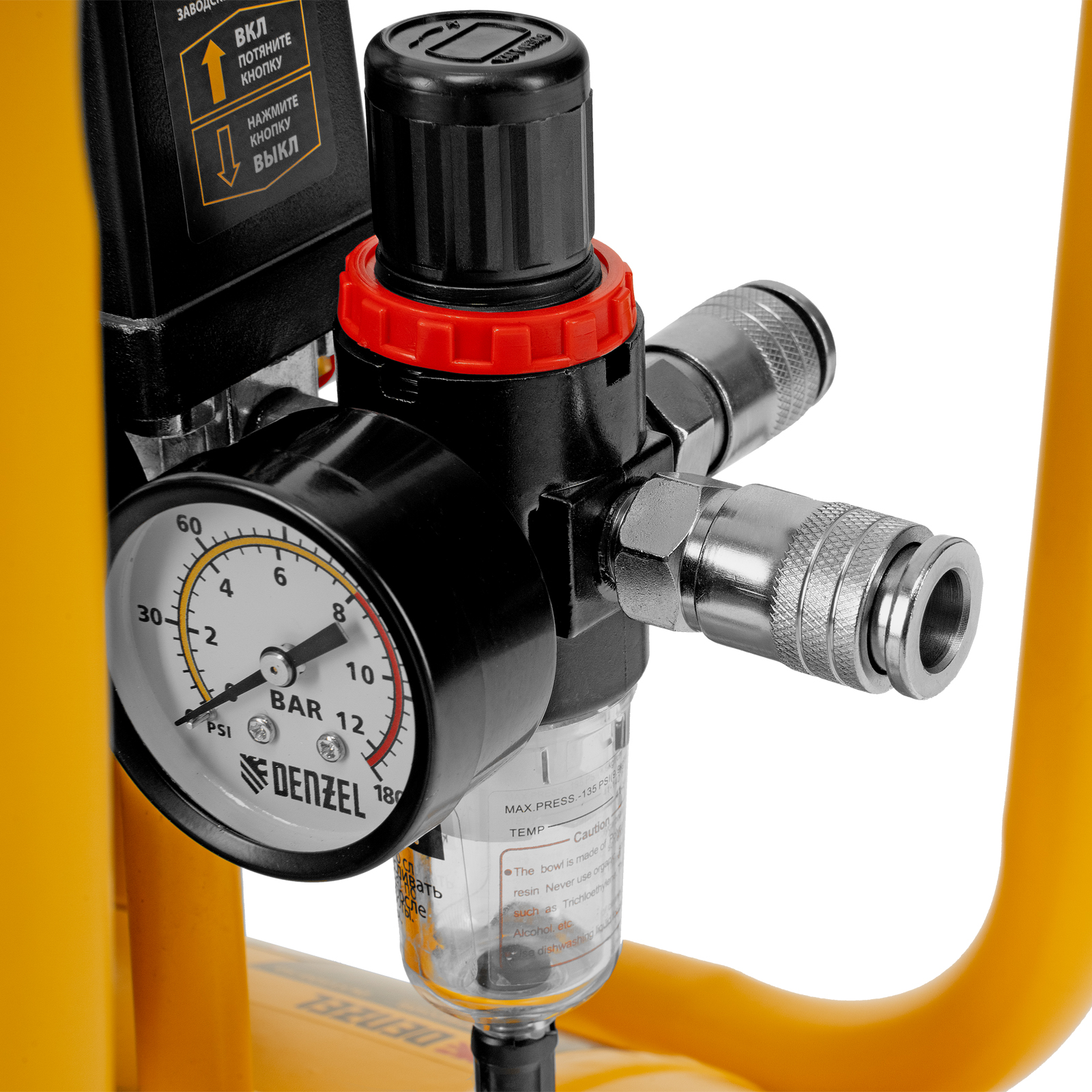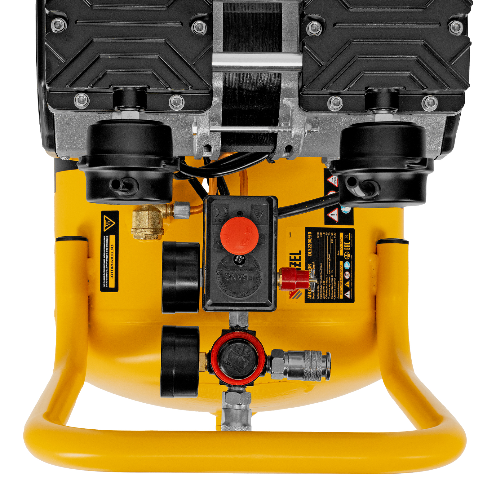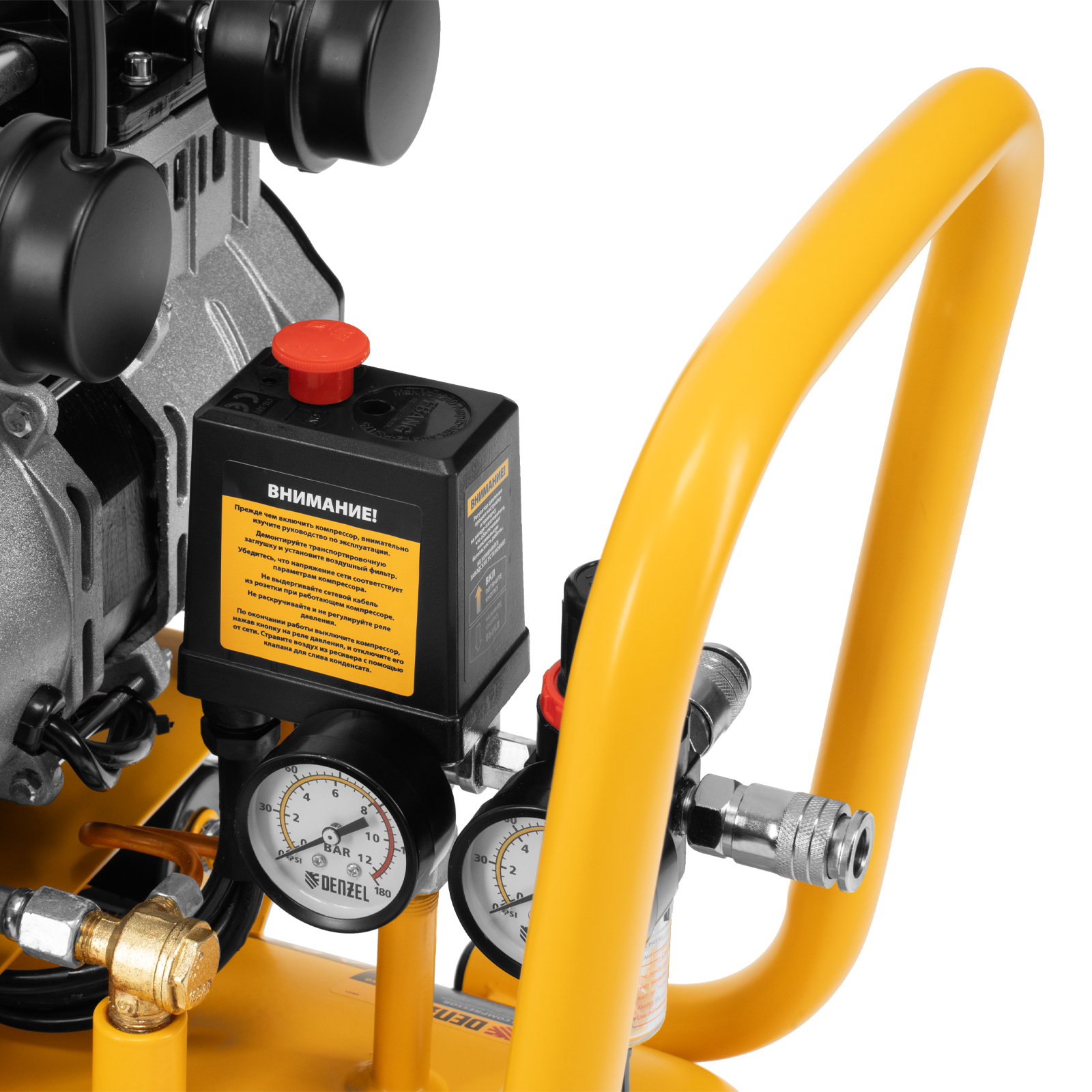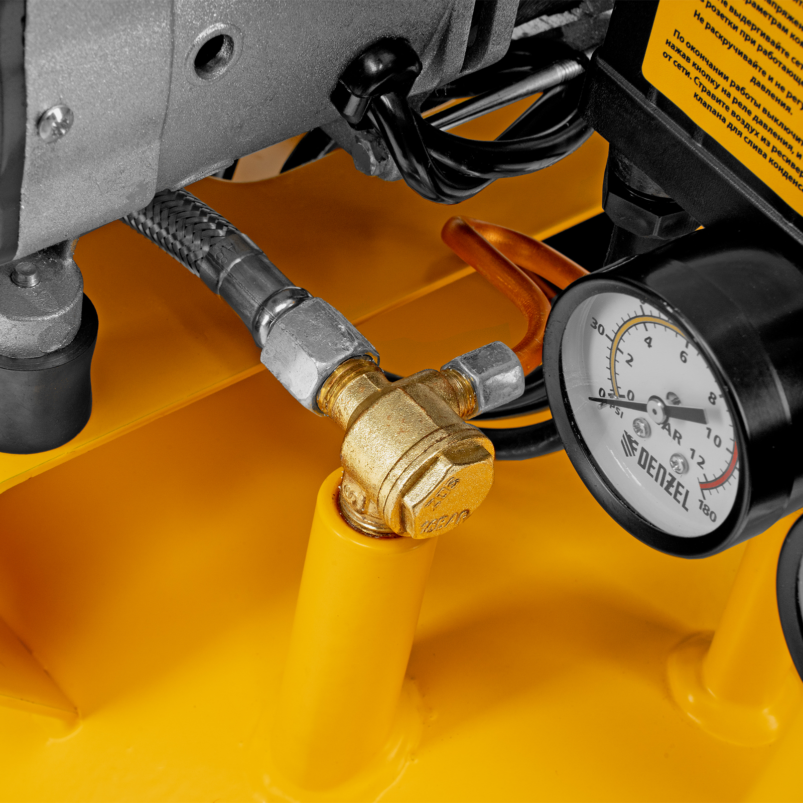 Безмасляный малошумный компрессор Denzel DLS 2200/50 58031 мощностью 2200 (2 х 1100) Вт, объемом ресивера 50 л и производительностью 380 л/мин предназначен для обеспечения пневмоинструмента сжатым воздухом, подаваемым под давлением до 8 бар. Частота вращения вала составляет 2800 об/мин, что позволило добиться увеличения производительности более чем на 40%. Компрессор позволяет подключить пневматический заклепочник, дрель, шлифмашину и т.д. Оптимален для работы с краскопультом и для продувки электронных компонентов, т. к. в сжатом воздухе отсутствуют частицы масла. Компрессор пригодится в мастерской, гараже, на строительной площадке.
