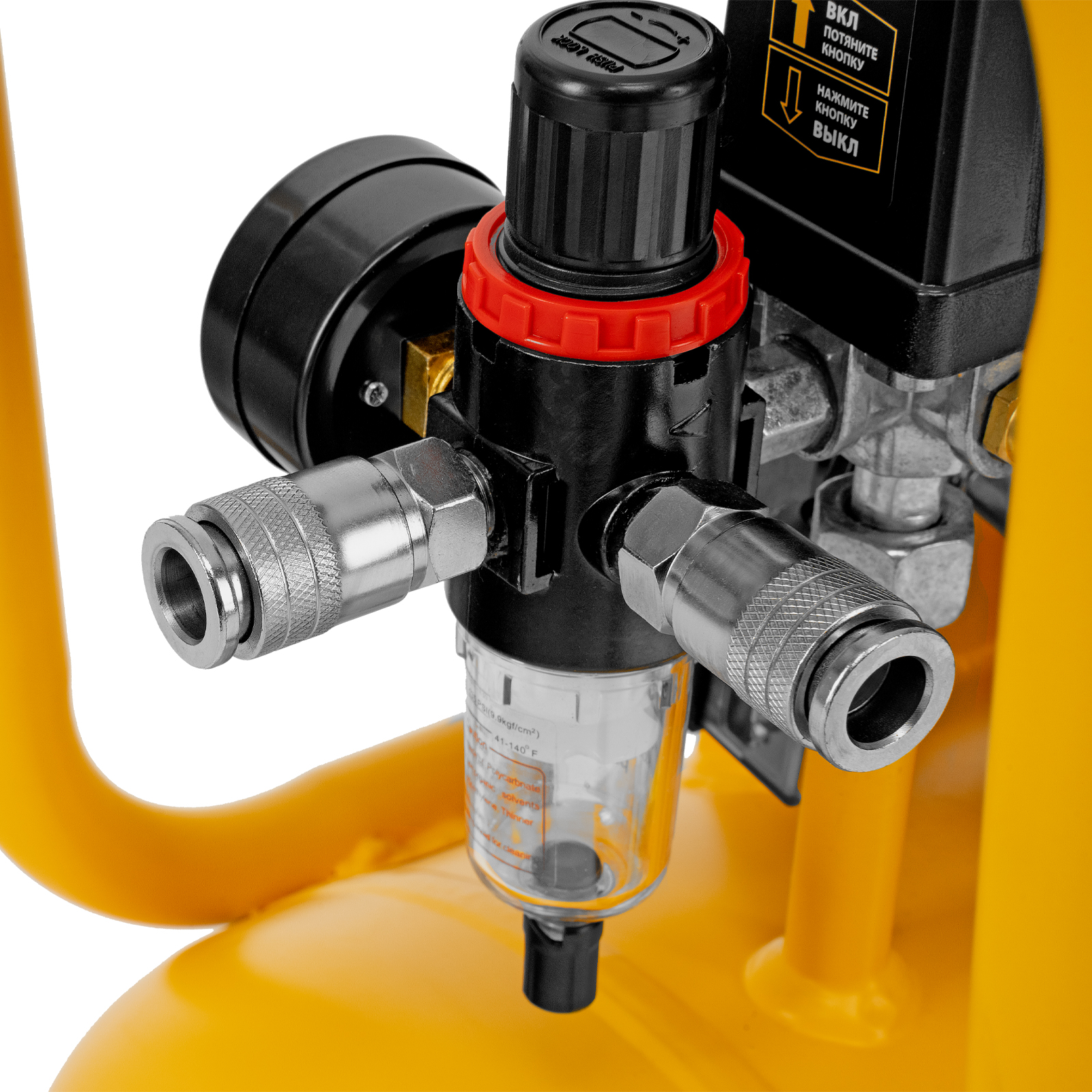 - Регулятор давления на выходе — можно выбрать оптимальный режим подачи воздуха в соответствии с характеристиками пневмоинструмента.