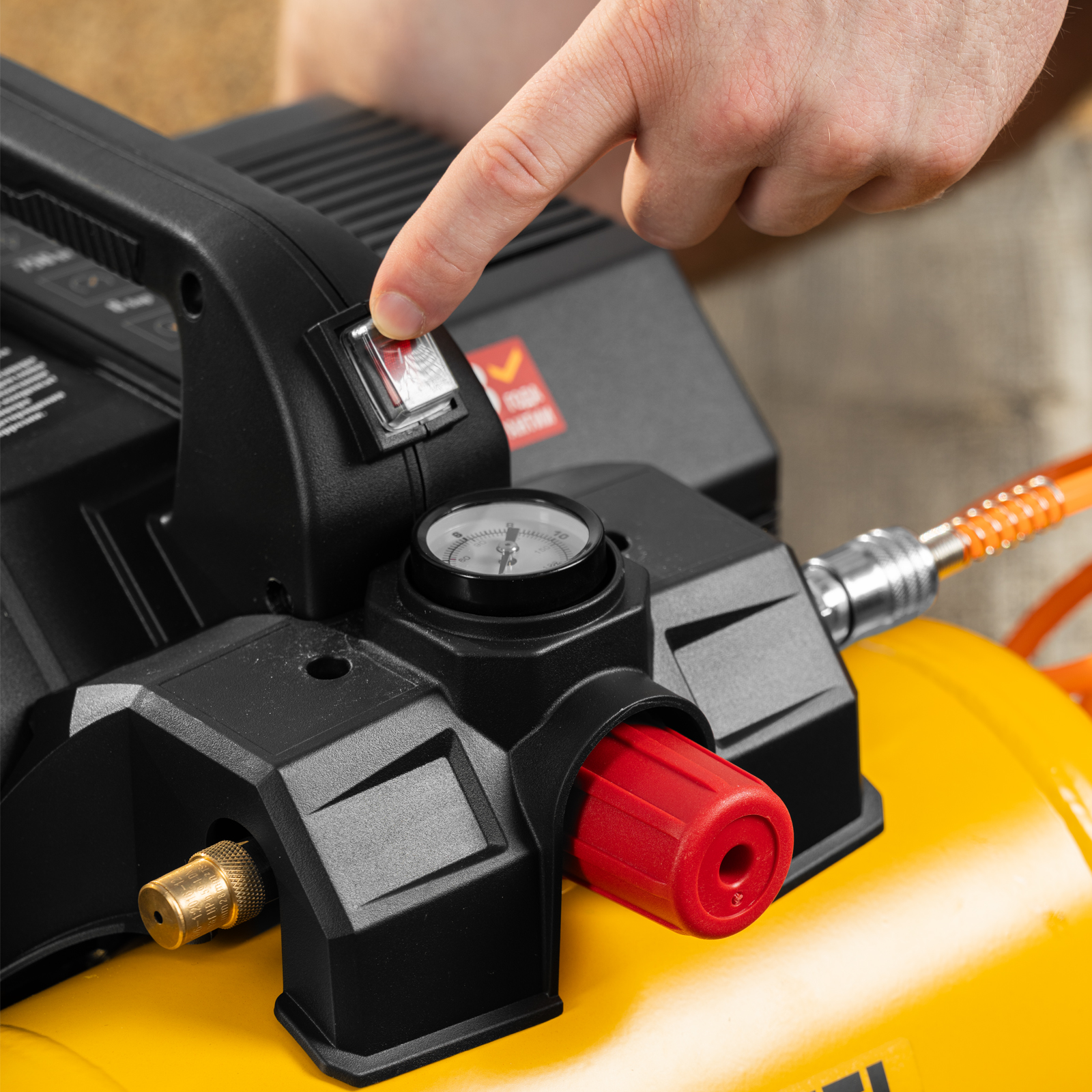 компактный размер_защита мотора от перегрева_малый вес_минимальная вибрация по сравнению с масляными компрессорами_можно использовать в жилом помещении_регулятор давления и манометр для контроля расхода воздуха и давления_сплошной кожух для дополнительного снижения шума
