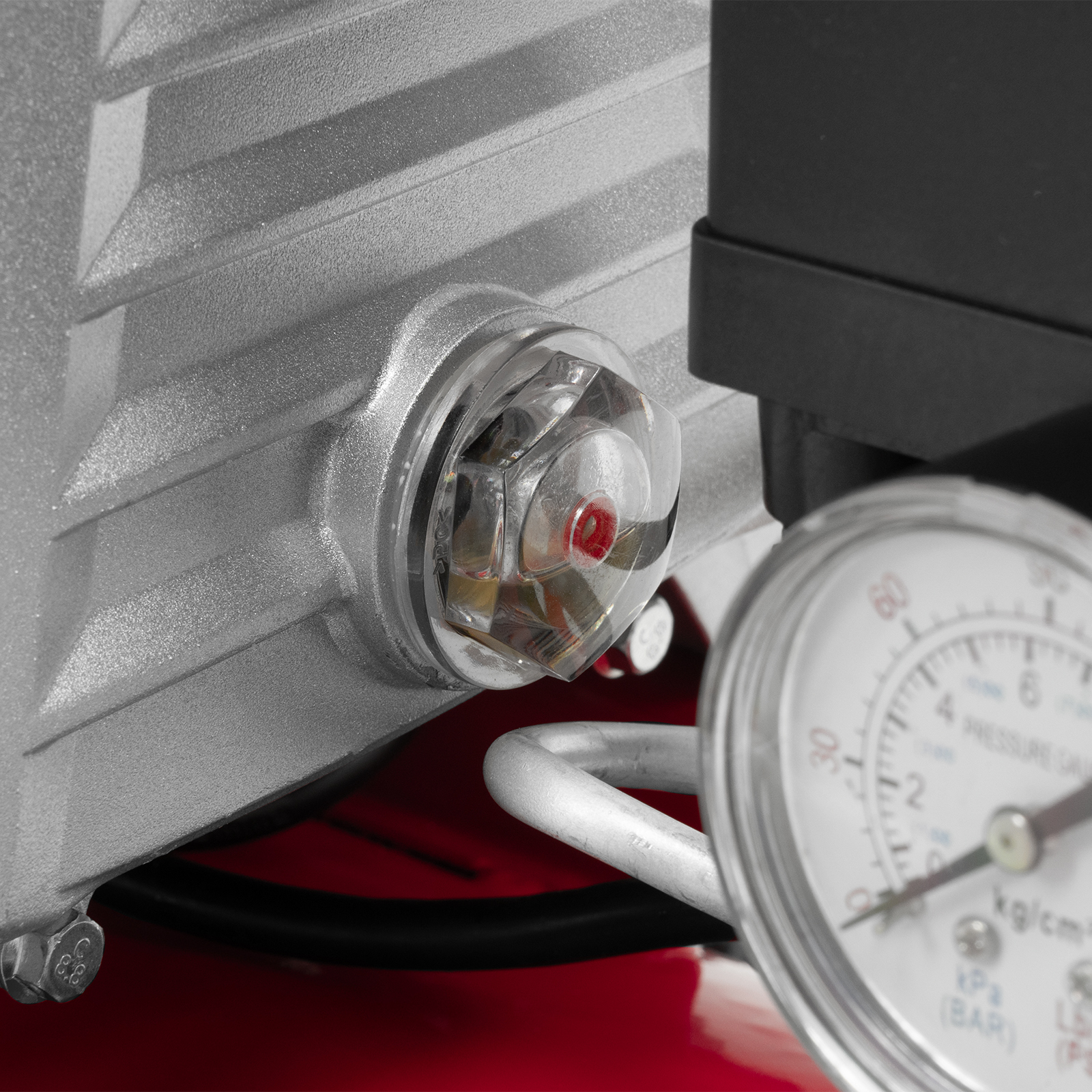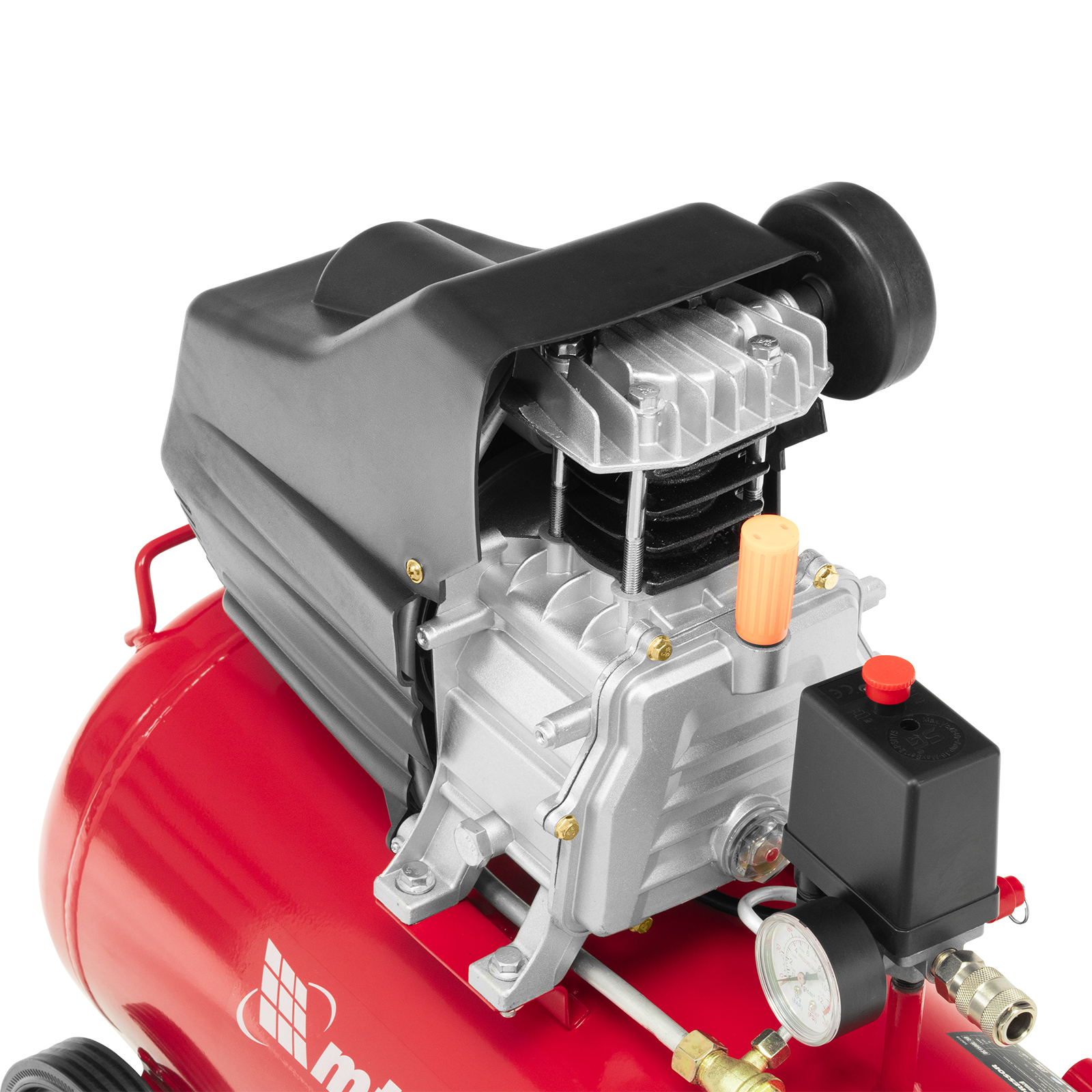 - Удобный контроль давления в ресивере — компрессор оснащен механическим манометром.