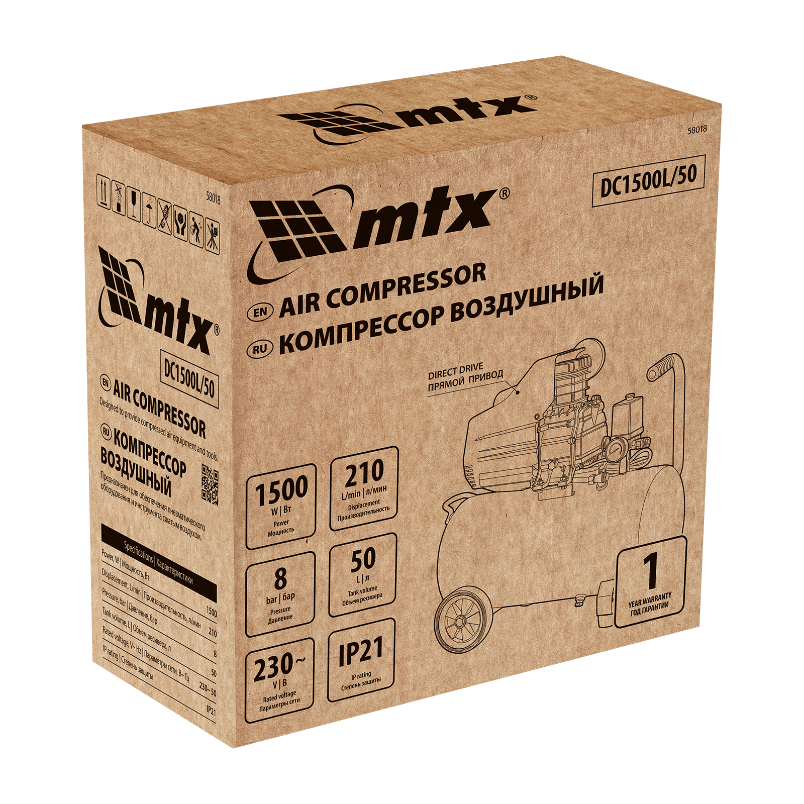 Компрессор воздушный MTX DC1500L/50 58018 мощностью 1,5 кВт и производительностью 210 л/мин, с ресивером объемом 50 л, предназначен для обеспечения сжатым атмосферным воздухом пневматического инструмента. Способен подавать до 210 литров сжатого воздуха в минуту при максимальной нагрузке. Компрессор относится к бытовому классу, применяется при проведении строительно-ремонтных работ и совместим с такими пневмоинструментами, как краскопульт, степлер, продувочный пистолет и др.