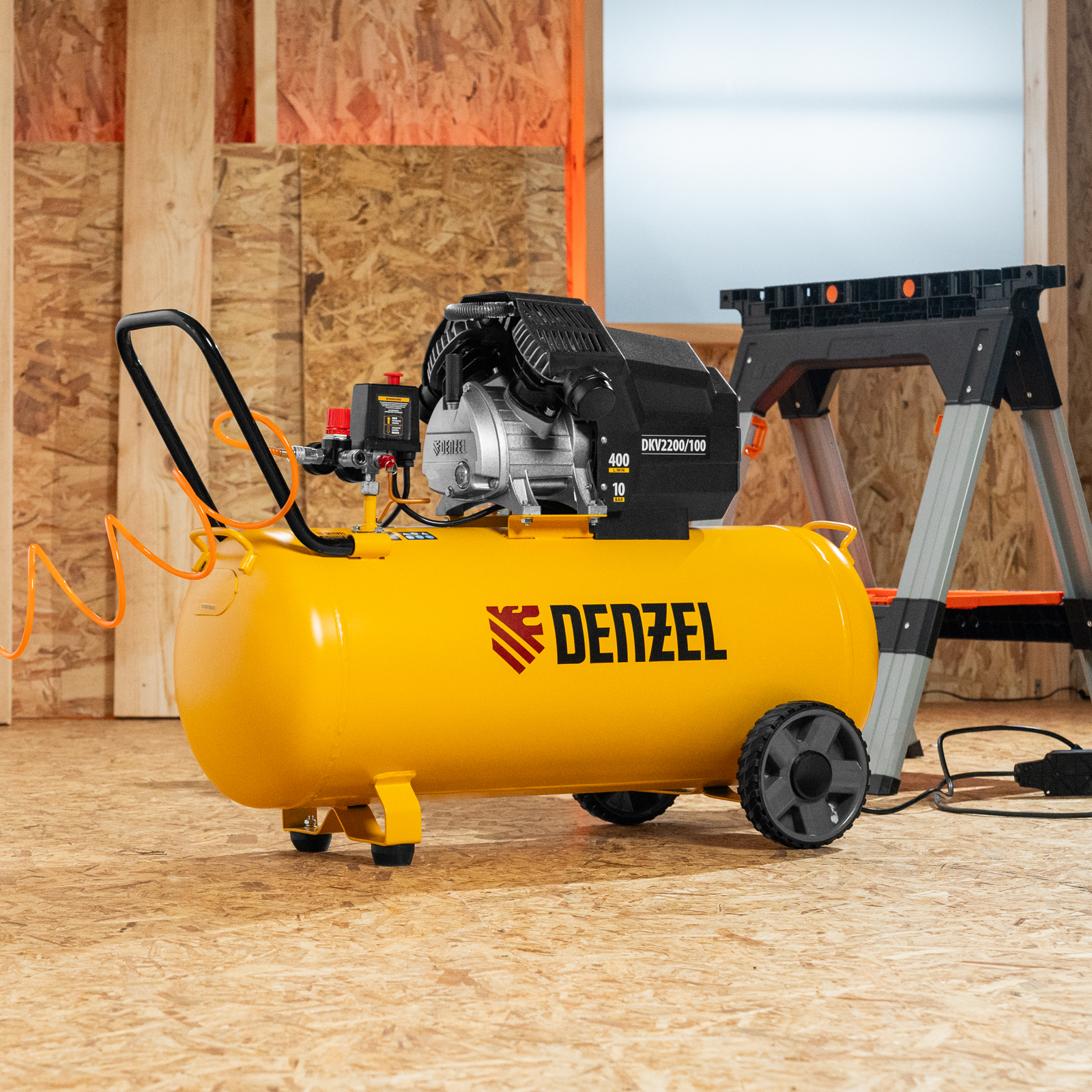 Компрессор Denzel X-PRO DKV2200/100 58079 мощностью 2,2 кВт, с ресивером объемом 100 л, обеспечивает производительность 400 л/мин, что позволяет использовать его в гараже, автомастерской, в строительстве и на небольшом производстве. Его мощности хватит для обеспечения работы пневмоинструментов, например, продувочных и окрасочных пневмопистолетов, пневмонейлеров, пневмостеплеров.