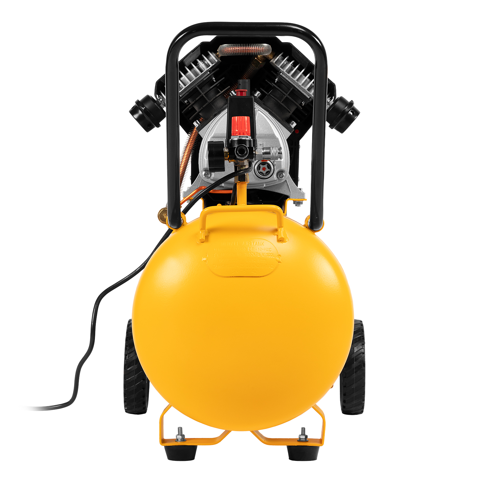 - Мобильность — большие колеса и П-образная ручка позволяют легко перемещать компрессор по рабочей площадке.