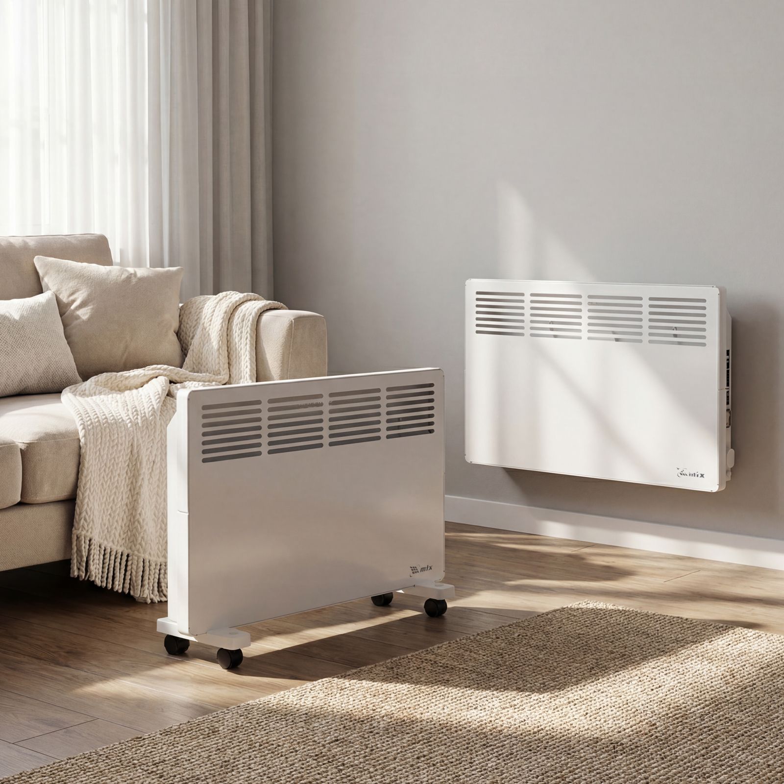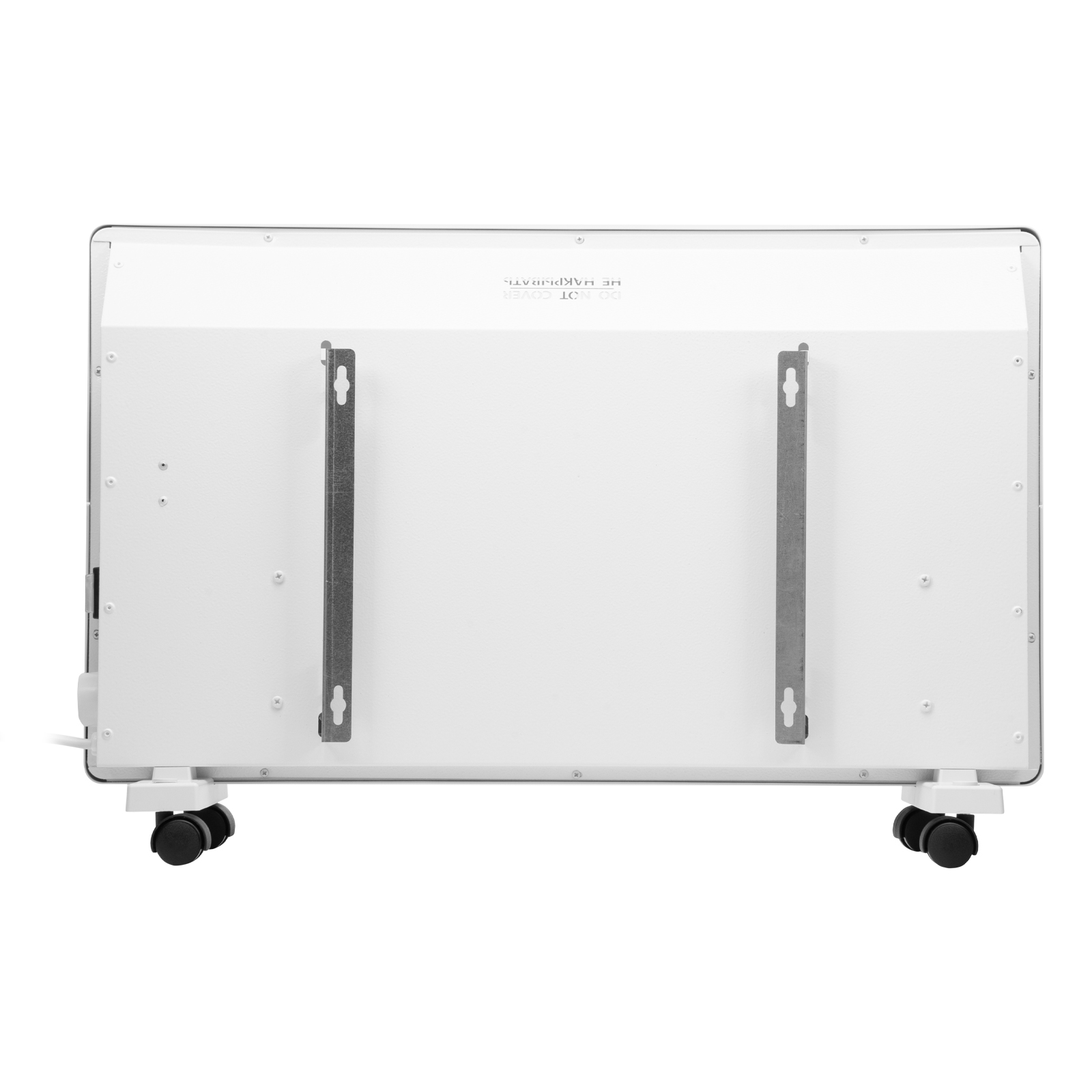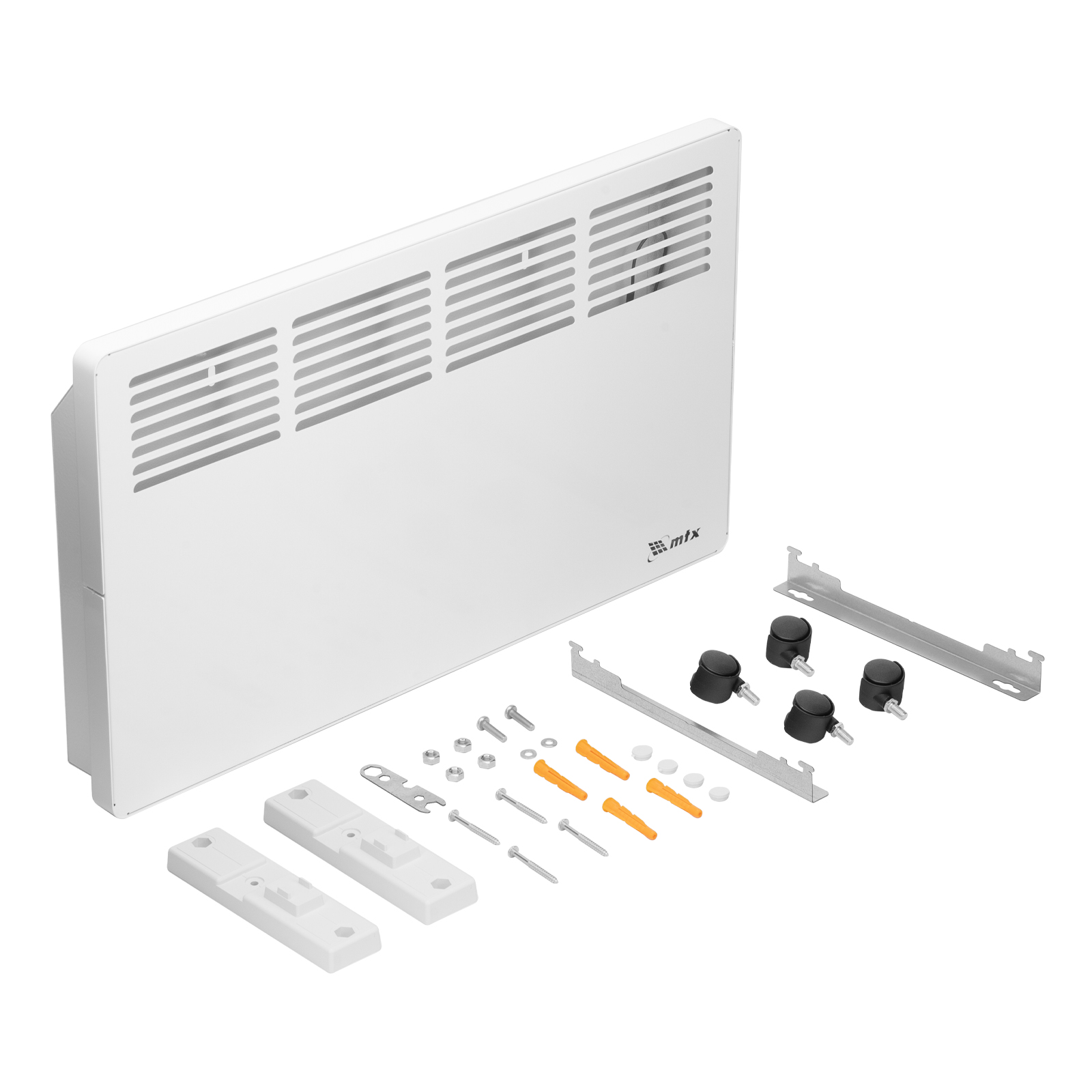 - Два варианта монтажа — конвектор можно расположить на полу или повесить на стену (колесные пары и кронштейн входят в комплект поставки).