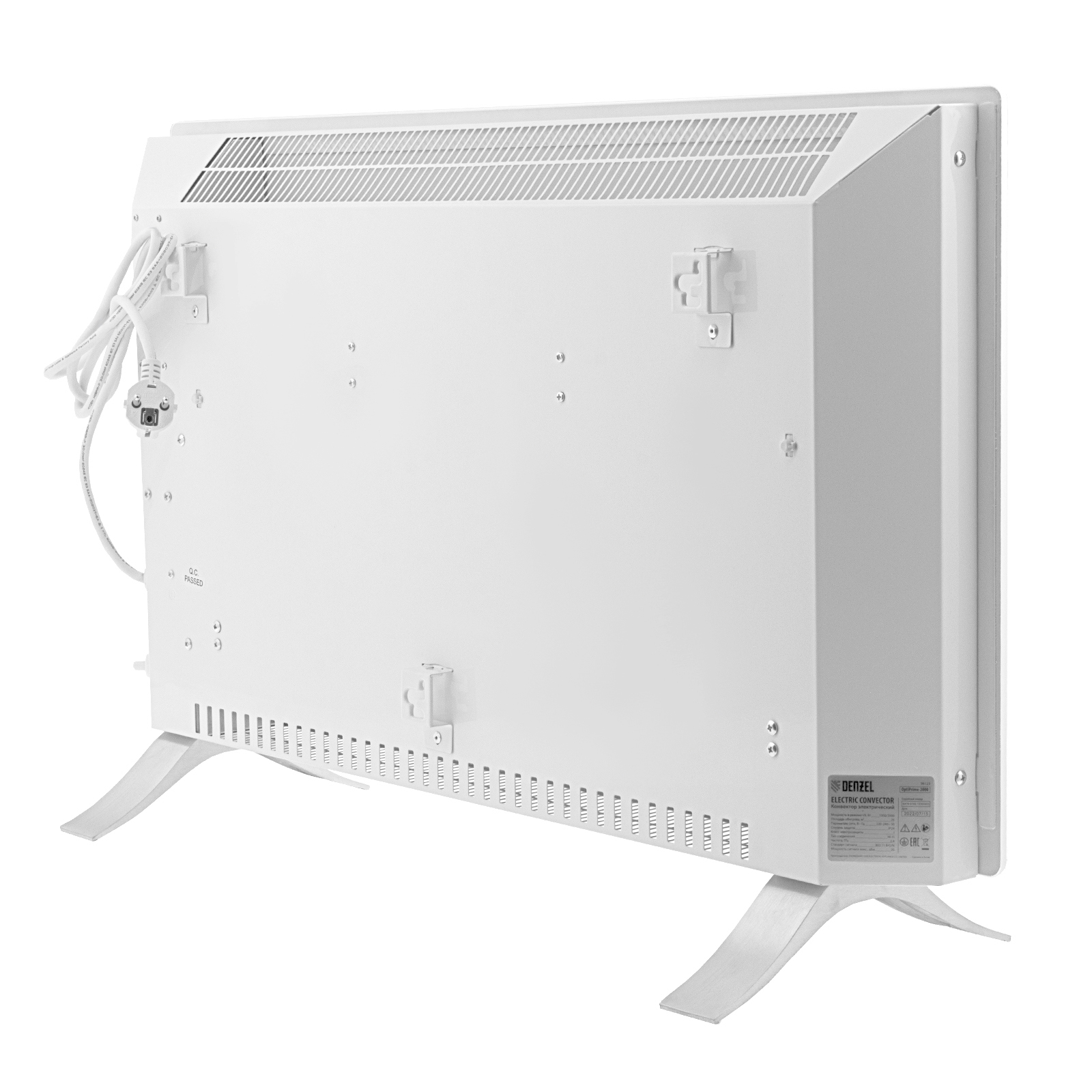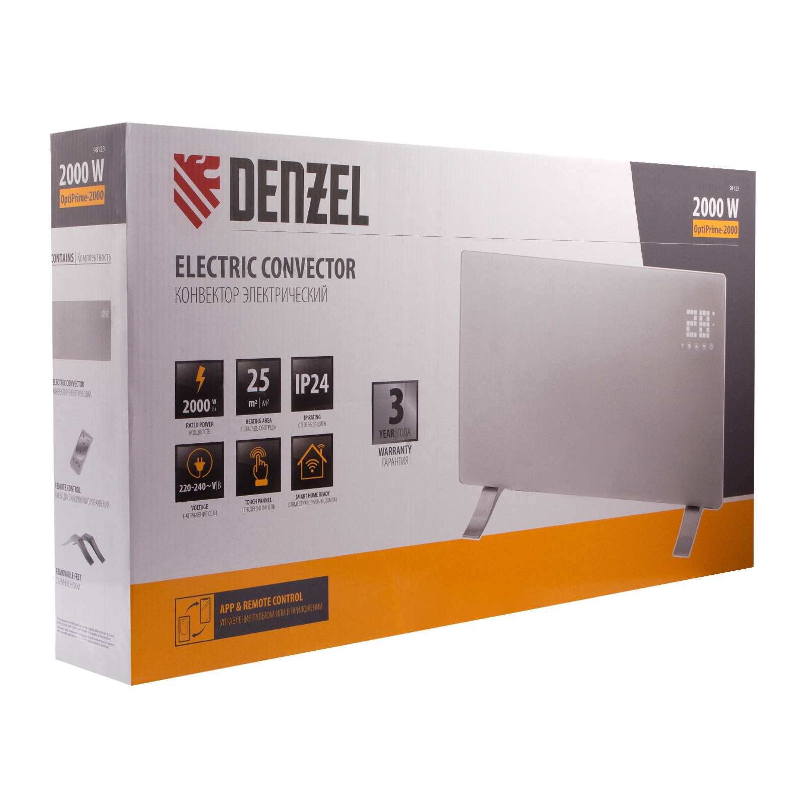 Электрический конвектор Denzel OptiPrime-2000 98123 максимальной мощностью 2000 Вт, с тачскрином, цифровым термостатом и функцией подключения к Wi-Fi, рассчитан на обогрев квартиры, дачи, загородного дома, офиса, а также пригодится в производственных, бытовых и общественных помещениях. Рекомендуемая площадь обогрева — 25 кв.м. Две мощности обогрева 1000 и 2000 Вт позволяют поддерживать температуру в отапливаемой комнате и полностью прогревать холодные помещения.,Устройство оснащено Х-образным нагревательным элементом — самым долговечным среди аналогов, обеспечивающим максимально равномерный прогрев помещения. Конвектор не сушит воздух, не сжигает пыль и исключает появление неприятного запаха.